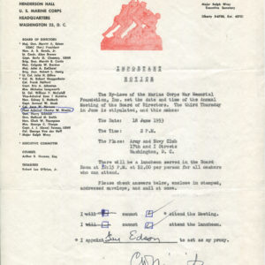 1953 Admiral Chester Nimitz Writes He Will Not Attend a Marine Corps War Memorial Foundation Meeting
