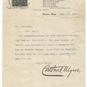 1919 Pastor Cortland Myers Congratulates U.S. Congressman James Gallivan “on your splendid victory for rum and the devil”