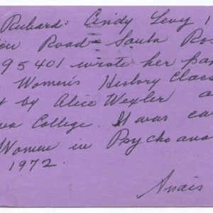 1973 Writer Anais Nin Identifies Author of “Women in Psychoanalyses”