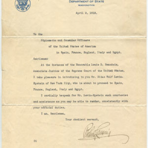 1918 U.S. Secretary of State Robert Lansing Writes at the Behest of Supreme Court Justice Louis Brandeis