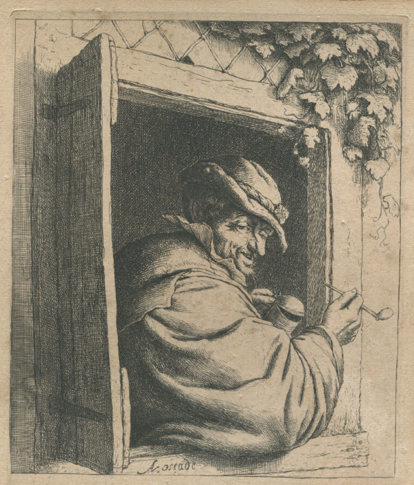 With a masterful sense of scale and composition, Ostade’s controlled cross hatching creates depth and form; from the voluminous smoker’s sleeve to the delicate grape leaves hanging over the window frame to the painstaking subtleties of the wooden shutter.
