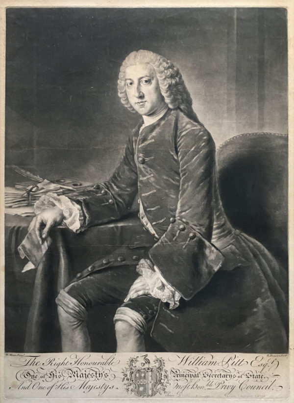 Description: We offer a scarce oversize mezzotint portrait of William Pitt from 1754. The plate is 15 3/8” x 11” on laid paper that is 17 ½” x 13 ½”. The text under the image reads “One of his Majesty’s Principal Secretary’s of State, And One of His Majesty’s most Honble. Privy Council.’, and “W. Hoare Pinxt. / R. Houston Fecit / sold by R. Houston, at Charing Cross”. Pitt’s expression and attire are rendered with a luminous, silken, near photographic accuracy. Copies of this portrait are housed in prominent print collections and libraries, including the National Portrait Gallery and the British Museum. Item #PR00286.