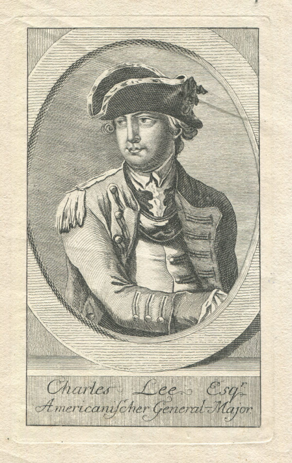 Description: We offer an early engraving of Charles Lee from “Geschichte der Kriege in und ausser Europa” [History of Wars in and out of Europe] by Christoph Heinrich Korn. The plate is 6 ½” x 4” on laid paper 8” x 6 ½”. Lee looks off to the left in a naturalistic pose, in this half-length portrait framed in an oval architectural detail and with the title in German below; “Charles Lee Esqr Amercanisscher General Major.” This title contains an error, confusing the lawyer Charles Lee (who became U.S. Attorney General) with the career military officer.