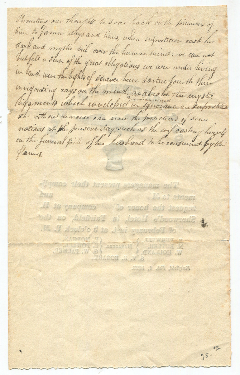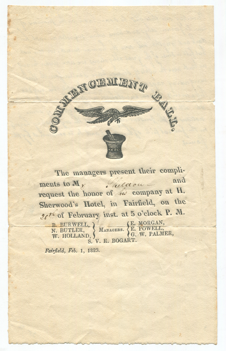 Description: This part-printed missive invites a Mr. Sheldon to the Fairfield Academy’s 1823 Commencement Ball at “H. Sherwood’s Hotel, in Fairfield, on the 20th of February”. An eagle over a mortar and pestle decorate the invitation.