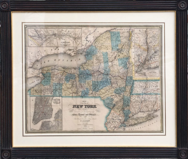 Description: We offer a framed 1840 pocket map of New York State by J. Calvin Smith. Sight size is 19” x 24 ½” and it is housed in a fine block cornered reproduction frame by Wesley Allen Frame Makers (27 1/2″ x 32 7/8”). The printed legend reads: “Map of the State of New York Showing the Location of Boundaries of Counties & Townships, Cities, Towns and Villages: the Courses of Rail Roads, Canals & Stage Roads, by J Calvin Smith, New York, published by J. Disturnell, No. 124 Broadway. 1840. Engraved on steel by Sherman & Smith.