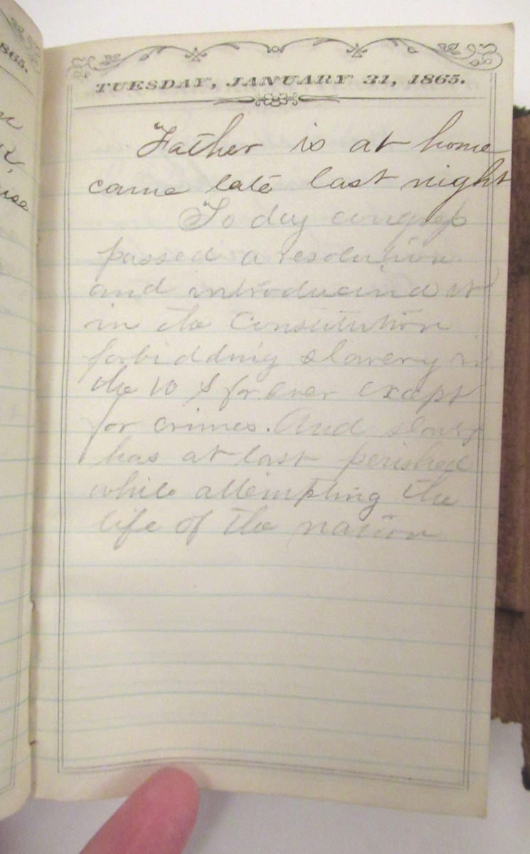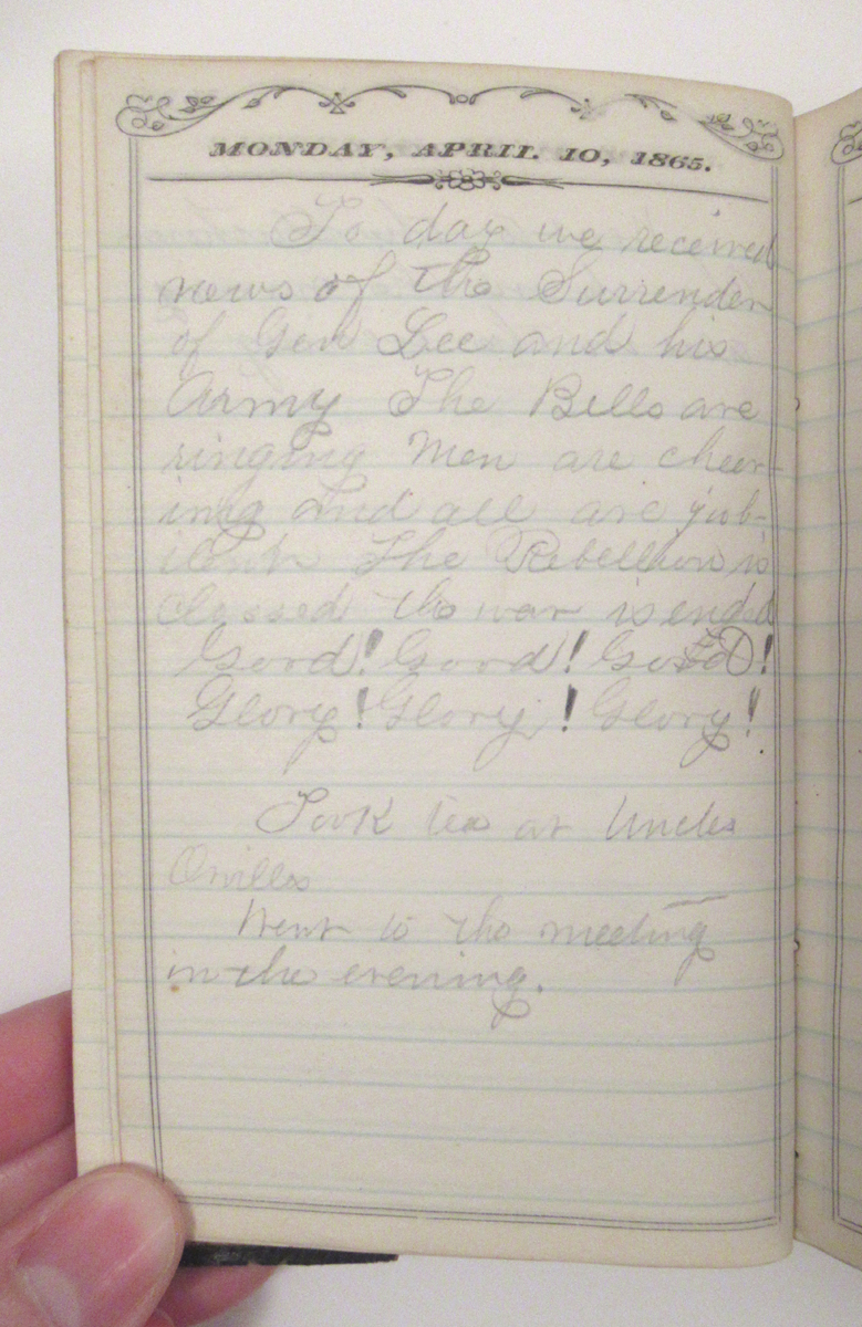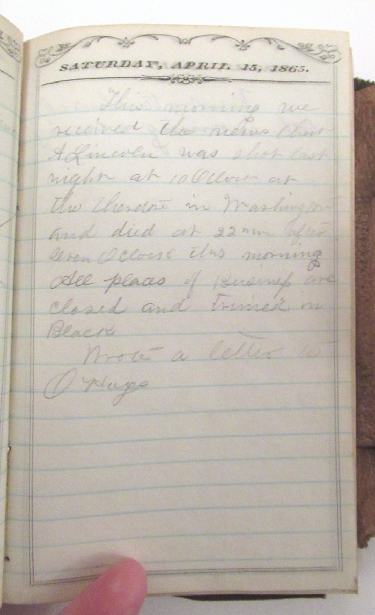 We learn that “Congress passed a resolution and introduced it in to [sic] constitution forbidding slavery . . . . And slavery has at last perished while attempting the life of the nation” (Jan 31). On Mar 4, “the Lyceum holds a public” while “President Lincoln is re-inaugurated.” Of Lincoln, Stover says, “He has served his country faithfully . . . and guided the ship through the storm thus far with great fortitude and looks as if he was destined to see his efforts crowned with success soon.” In March and April, he records Civil War gains and losses: “. . . reported from the Army that Gen Lee has surrendered his right wing to Gen Grant. Good news if so” (Mar 27); “Today Richmond was evacuated [sic] also Petersburg by the Rebels” (Apr 3). “Good news . . . Richmond is taken [sic] also Petersburg with 12,000 Rebs & 50 guns . . . ” (Apr 4). On April 10, he excitedly writes about the response to General Lee’s surrender, “The bells are ringing. Men are cheering and all are jubilent [sic]. The rebellion is clossed [sic] the War is [sic] ended. Good! Good ! Good! Glory! Glory! Glory!” (Apr 10). He captures the somber mood surrounding Lincoln’s death: “This morning we received that A Lincoln was shot last night at the theatre in Washington and died at 22 min after seven o’clock this morning All places of Business are closed and trimed [sic] in Black” (Apr 15); We learn that “Funeral rites are observed throughout the Country. Services are held . . . Stores are closed from 11 am to 3 pm and firing of cannon from every ½ Hr from sunrise to sunset” (Apr 19). “Today Booth [sic] the murderer of the President was killed” (Apr 26).