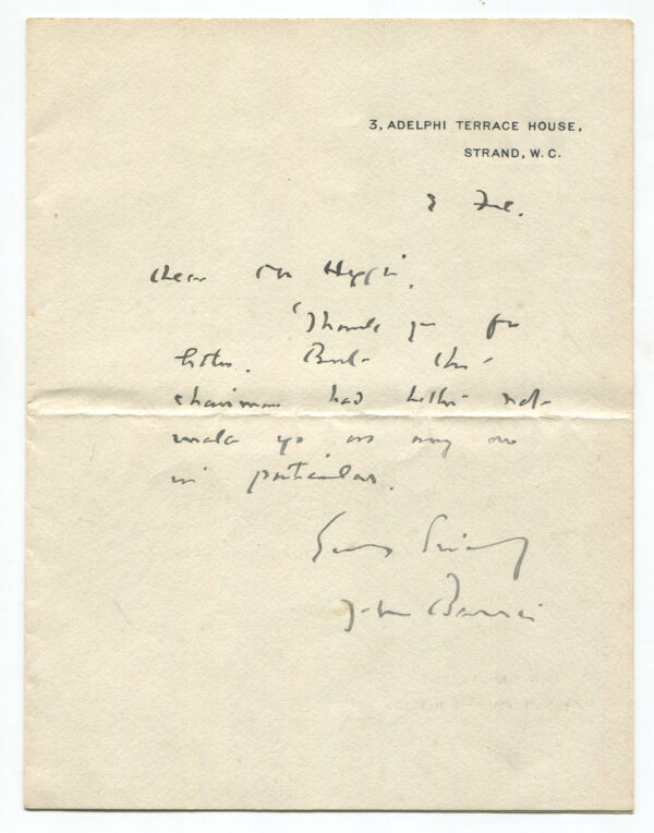 Autograph letter signed written on 7” x 5 ½” ivory stationery imprinted: “3, Adelphi Terrace House, Strand W. C.”