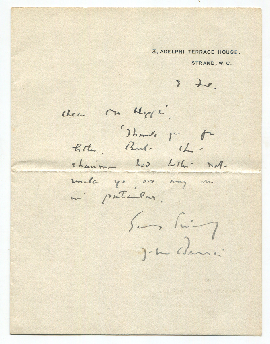 Description: On Feb 9, J. M. Barrie wrote a crisp note to Heggie (who appeared in Barrie’s short play, The Dramatists Get What They Want, and took the lead in Androcles and The Lion):