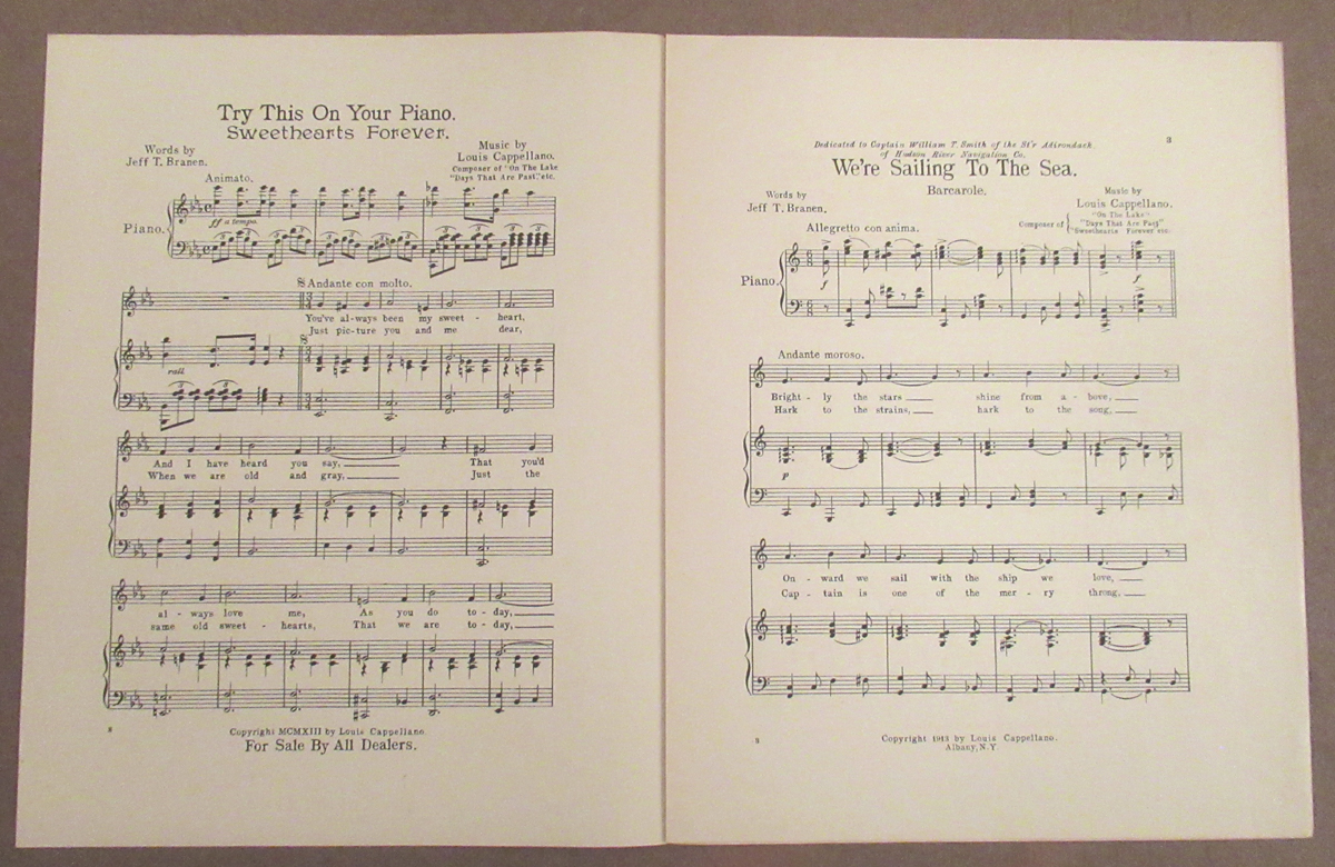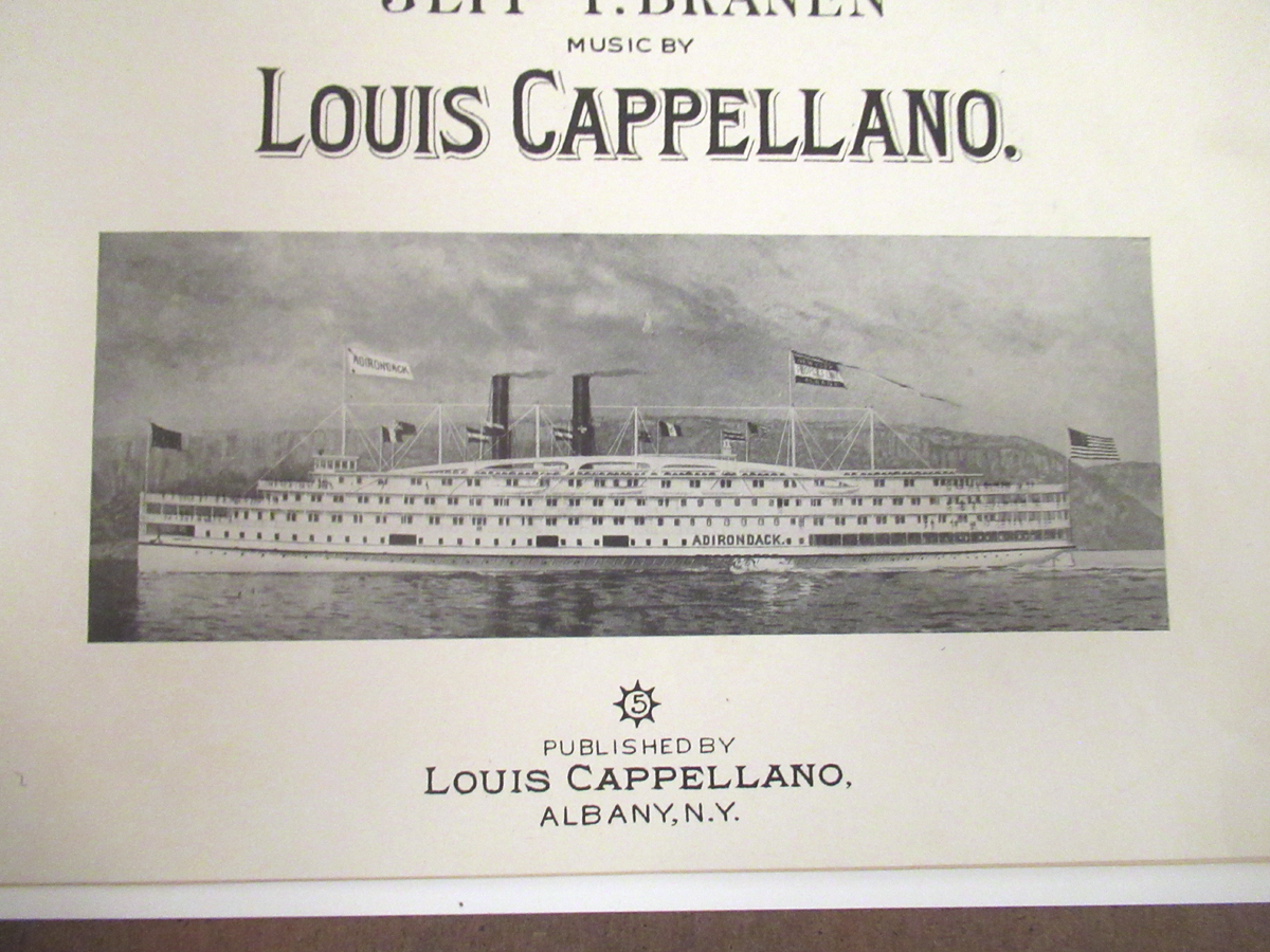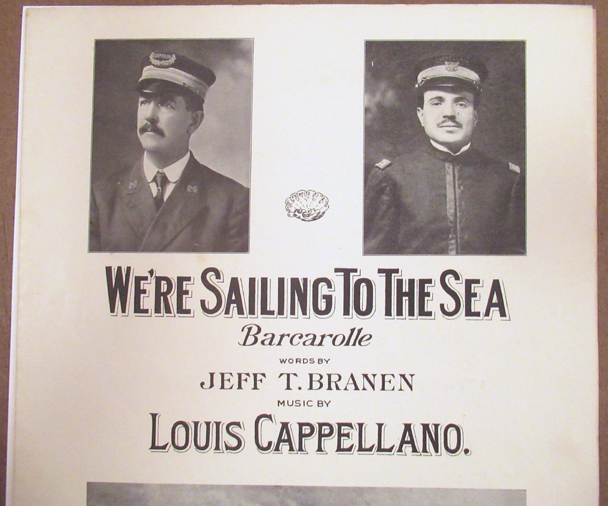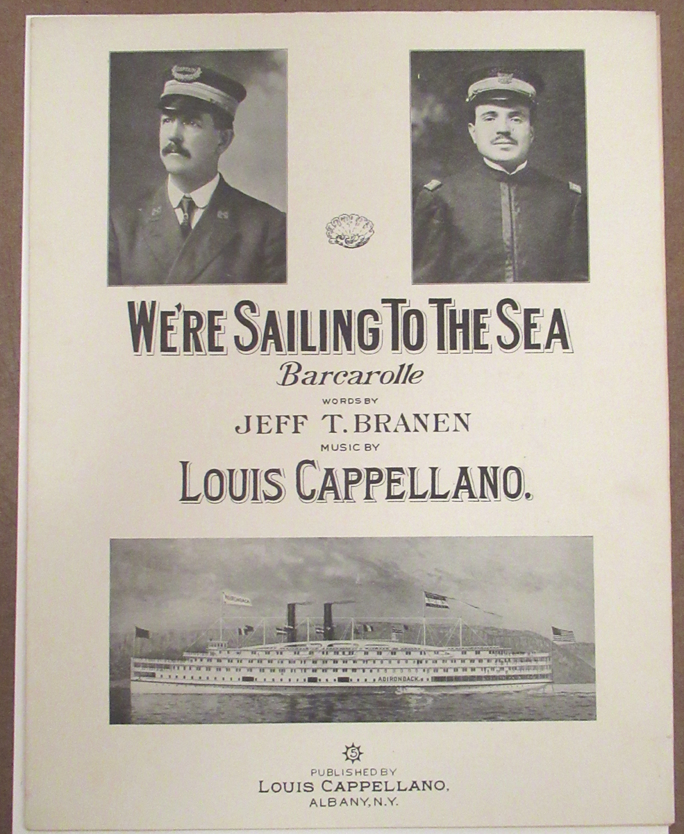 Description: This complete six-page sheet music is titled “We’re Sailing to the Sea”. The front wrap features an image of the Hudson River Dayline Ship “Adirondack” and portraits of the captain and the composer/publisher Louis Cappellano.