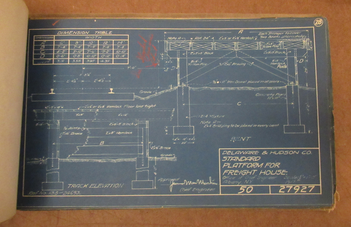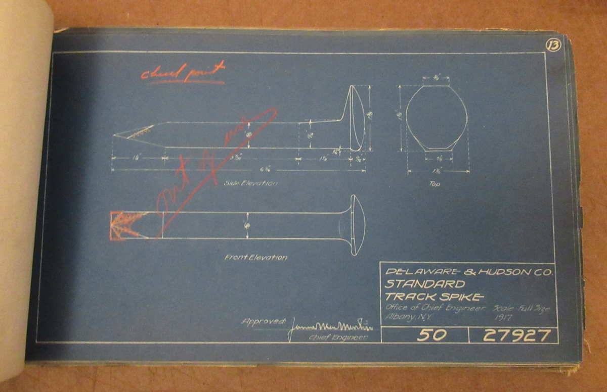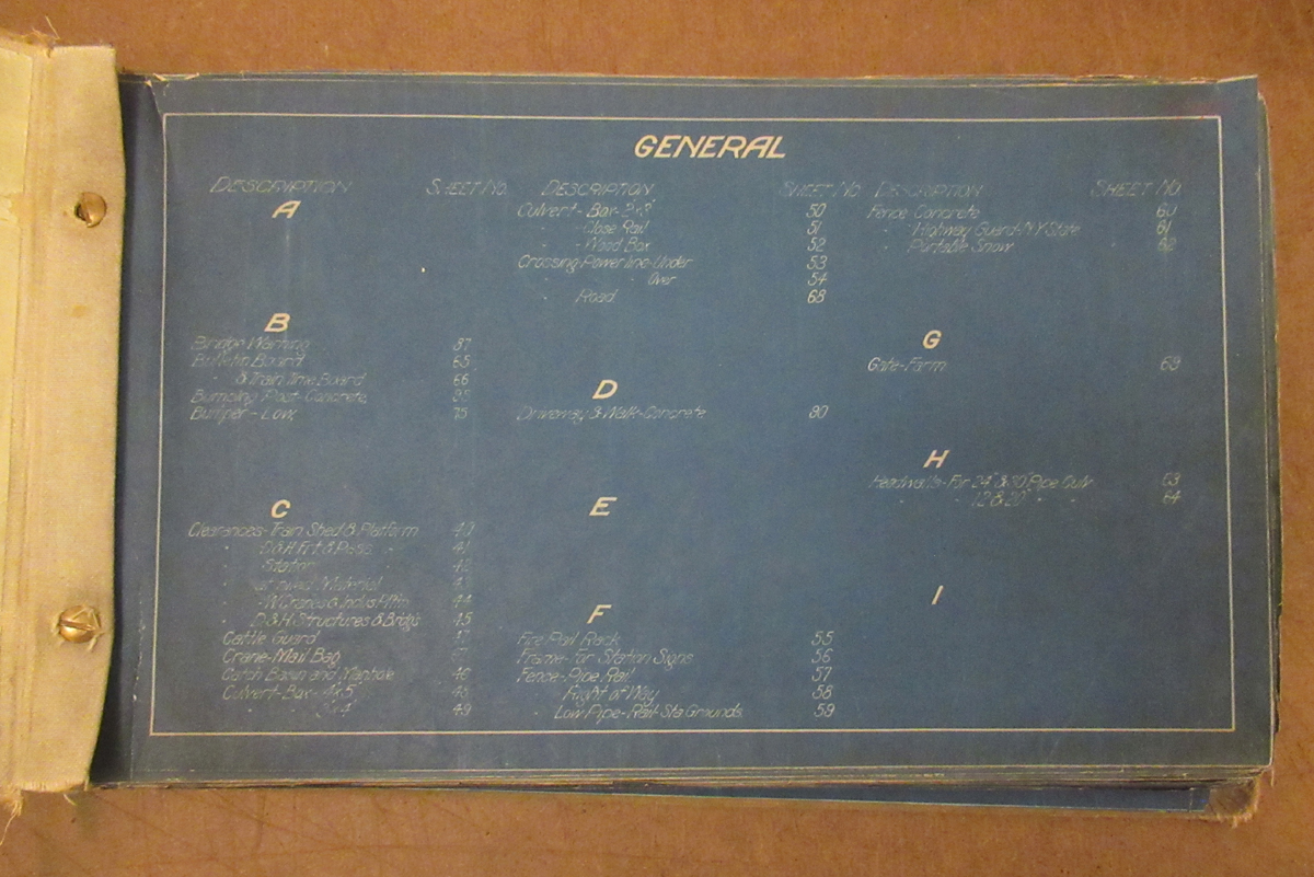 Description: This professionally bound compilation has five indexed pages and ninety-four blueprints–drawn to scale–of rail and accessories, such as: guard rails, angle plates, rail joints, track bolts, bridge warnings, enclosed milk platform, passenger station seat, etc.. They were approved by the Chief Engineer James MacMartin of the Delaware & Hudson Co. Albany, NY. The red, penciled date–2/10/32– on the general index and the red pencilled checkmarks and deletions on various prints suggest that the drawings were in use as recently as 1932.