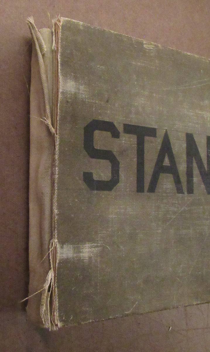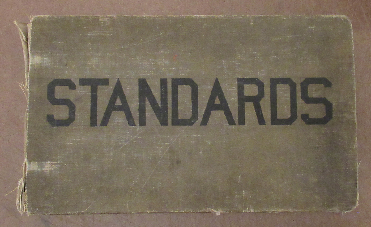 8 ½” x 14” cloth covered boards house the blueprints held together with brass screwposts. The front board is imprinted, in block letters, “STANDARDS”. Item# AM00390