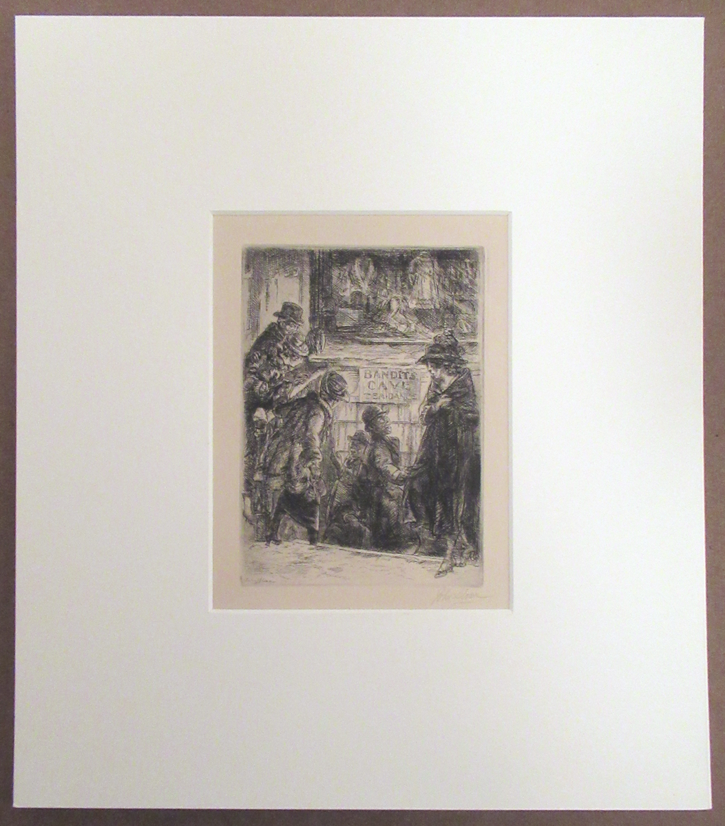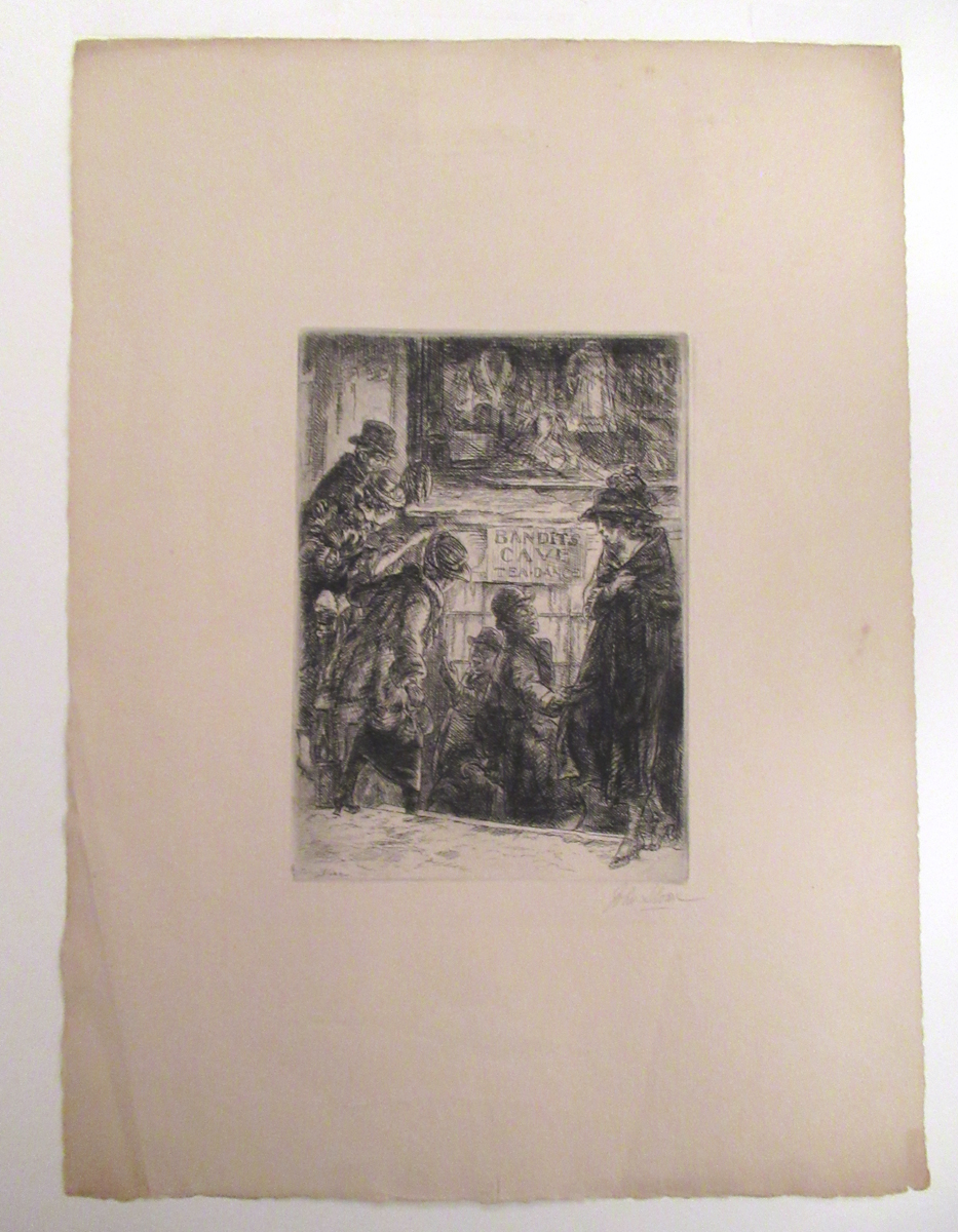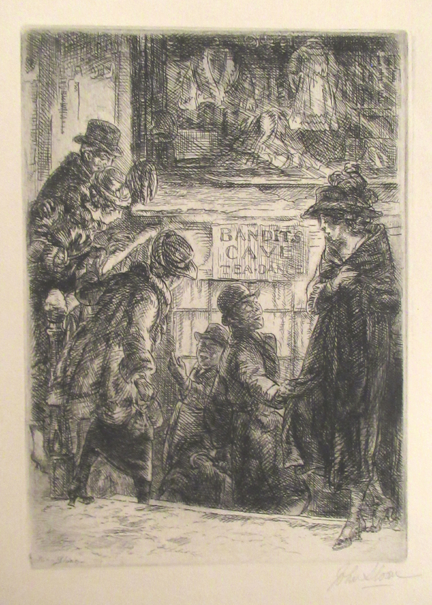 Description: This fine impression of a classic print by Sloan embraces his fascination with New York City nightlife. Here a group of revelers are entering a prohibition-era basement speakeasy with a sign that advertises “tea and dance.” Signed in graphite lower right: “John Sloan” and in the plate as well.
