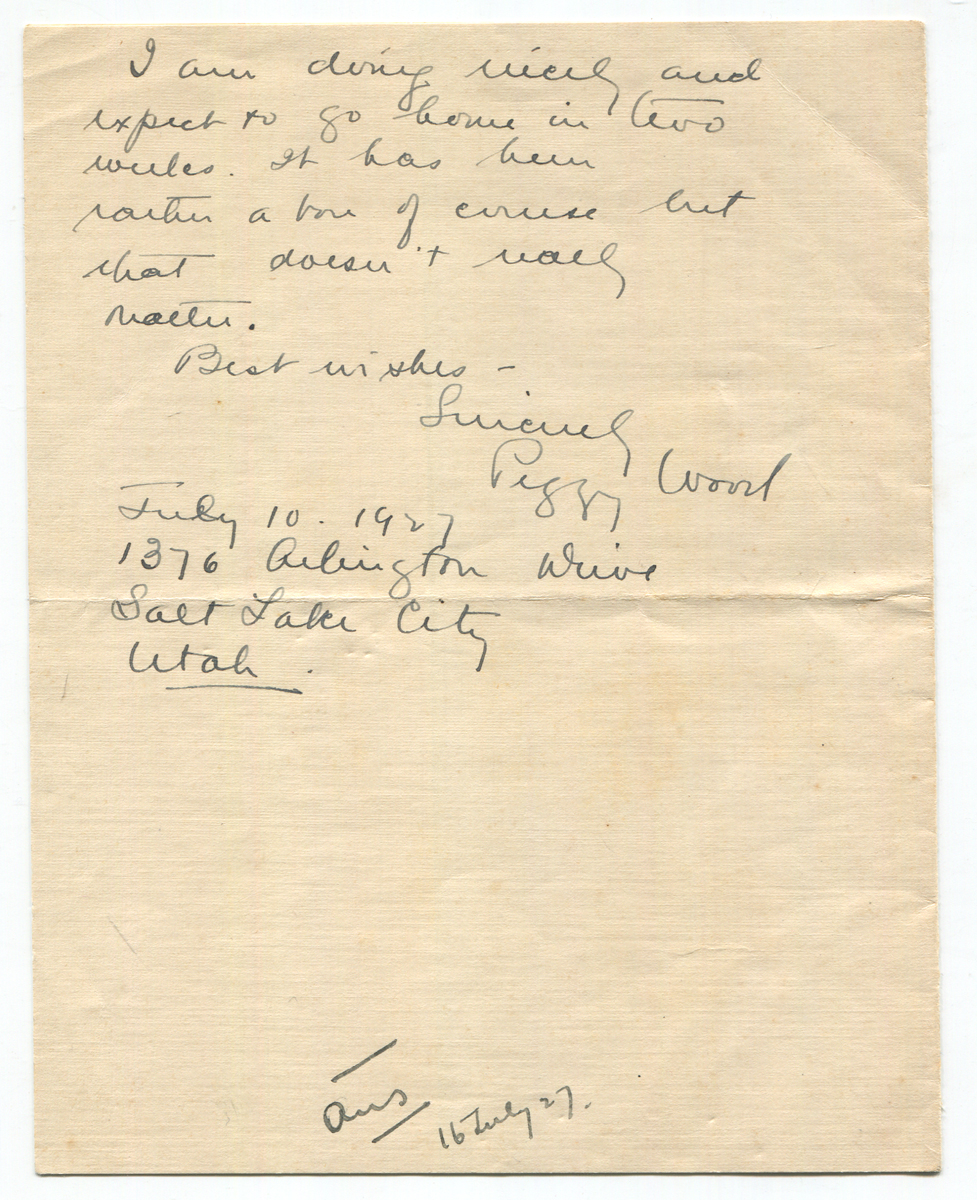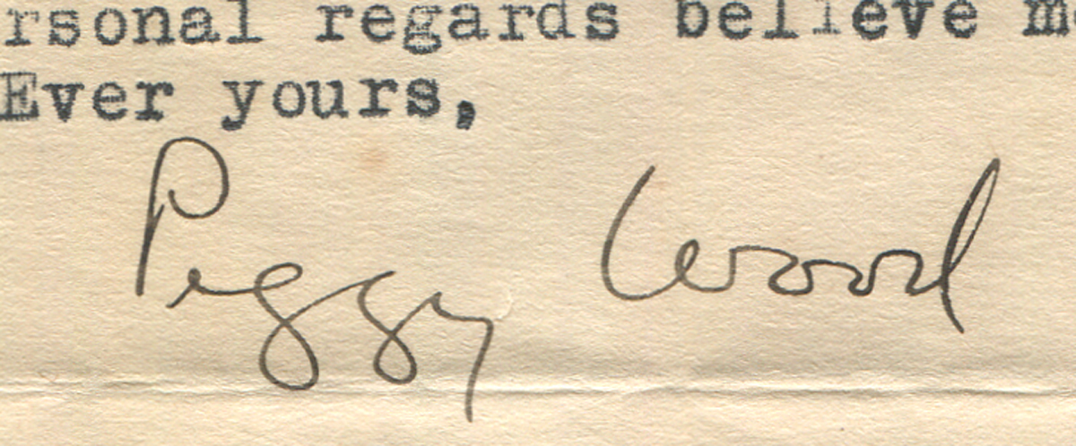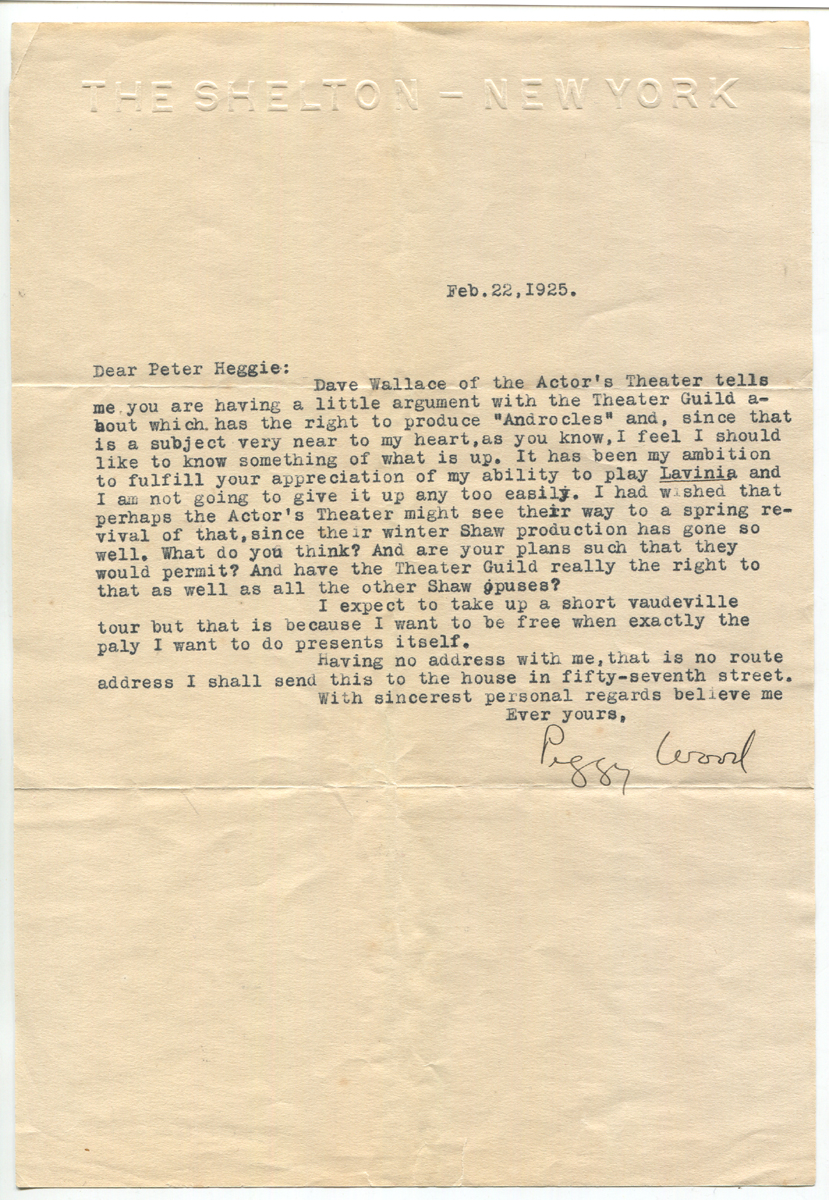 In the typed letter of Feb 22, 1925, which reveals some of the tensions in the theatrical world, Wood diplomatically asks “Dear Peter Heggie” about his “little argument with the Theater Guild” and its “right to produce ‘Androcles,’” as she “would like to know something of what is up.” She says it has been her “ambition to fulfill [Heggie’s] appreciation of [her] ability to play Lavinia and [she is] not going to give it up too easily.” She hopes that all their (the Guild’s, Heggie’s, and hers) schedules will allow a Spring performance.
