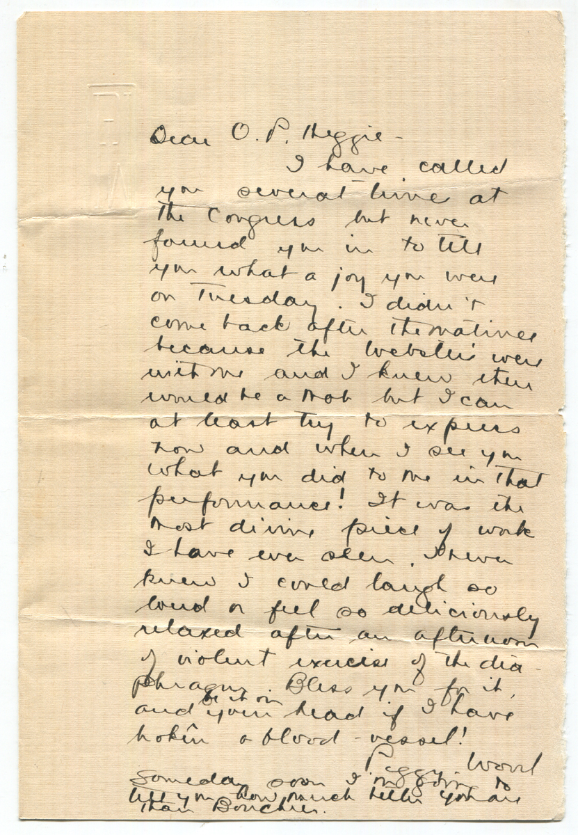 Unable to find “Dear O. P. Heggie” to express her “joy” in person, Peggy Wood writes glowingly of his performance, “It was the most divine piece of work I have ever seen, I never knew I could laugh or feel so deliciously relaxed after an afternoon of violent exercises of the diaphragm. Bless you for it and be it on you if I have broken a blood vessel!”