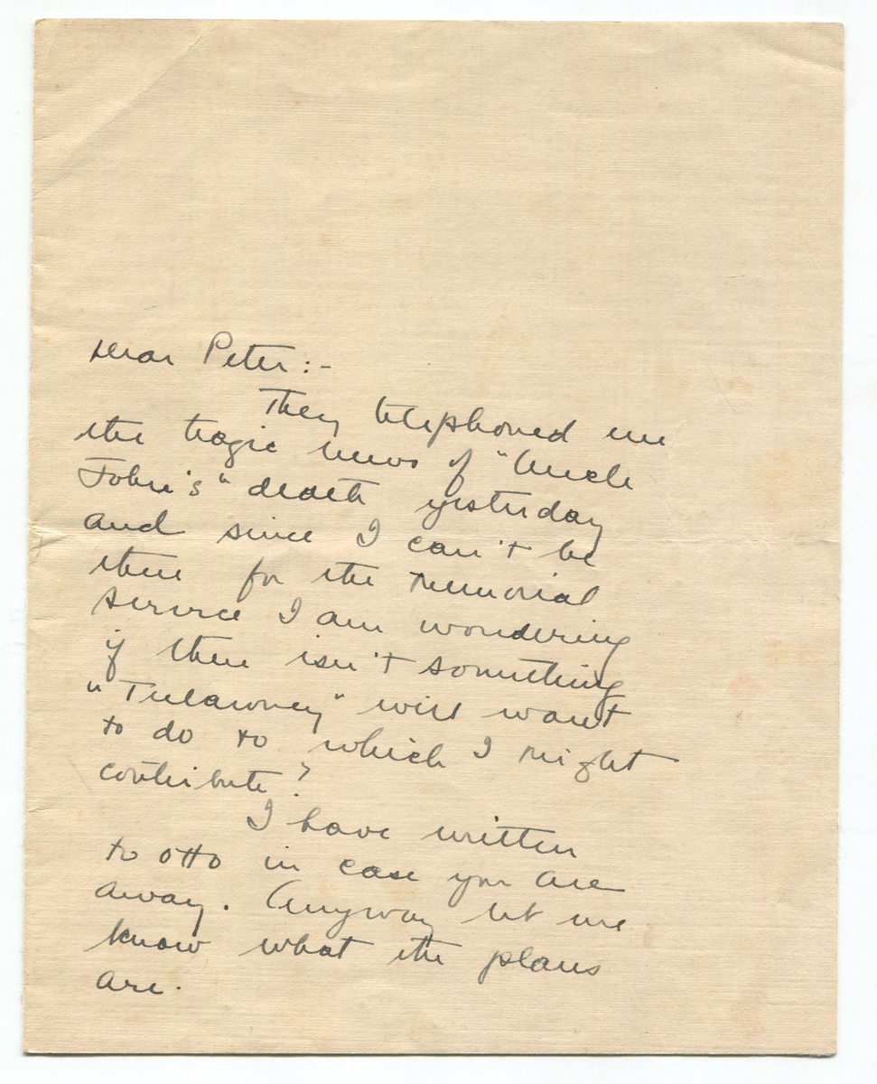 Unable to attend her uncle John’s memorial service, Wood asks “Dear Peter” “if there isn’t something ‘Trelawney’ will want to do to which [she] might contribute?”
