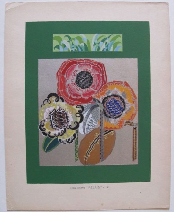 Description: We offer a print by the French artist Edouard Benedictus, image size is 14 3/8" x 11" on 18 5/8" x 14 5/8" heavy wove ivory paper. Two Art Deco motifs are presented on a cheerful green background: three bright poppy-reminiscent flowers and a thatch of grass. At the bottom of the image it is inscribed ‘Benedictus “Relais”-14’. Bold and graphic from a distance, with wonderful saturation and a bespoke, handmade quality when viewed closely. Item #PR00119.