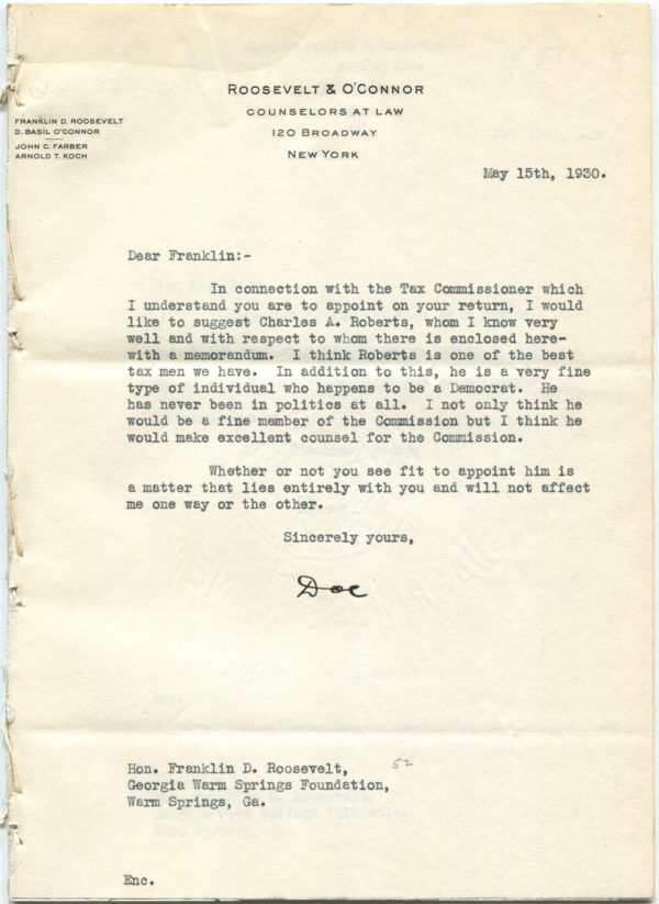 Description: The seven letters in this collection date from May-December of 1930. In several of the letters, Basil O’Connor makes recommendations for political appointments to his law partner and then-Governor of New York Franklin Delano Roosevelt. For example: "In connection with the county judgeship in Westchester County, you will remember that I spoke to you about Herbert McKennis, who is a Dartmouth man. He is not a candidate of mine in any sense, but he is a gentleman who merits your consideration if the matter comes before you."