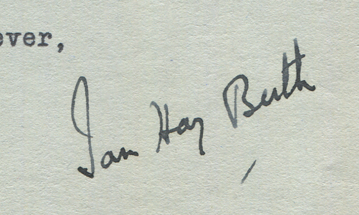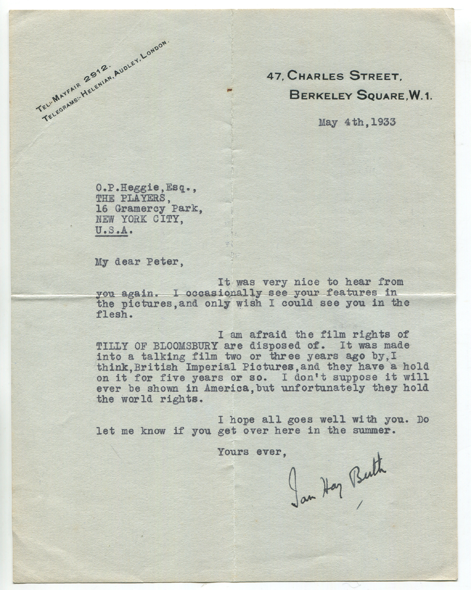 Description: Writer Ian Beith wishes he “could see [Heggie] in the flesh,” even though he sees his “features in the pictures”. He informs Heggie that “the film rights to TILLY OF BLOOMSBURY are disposed of” and that, “ [he thinks], British Imperial Pictures . . . have a hold on it for five years or so.” And as they had “the world rights,” he doesn’t expect “it will be ever shown in America.” Signed, “Yours ever / Ian Hay Beith”
