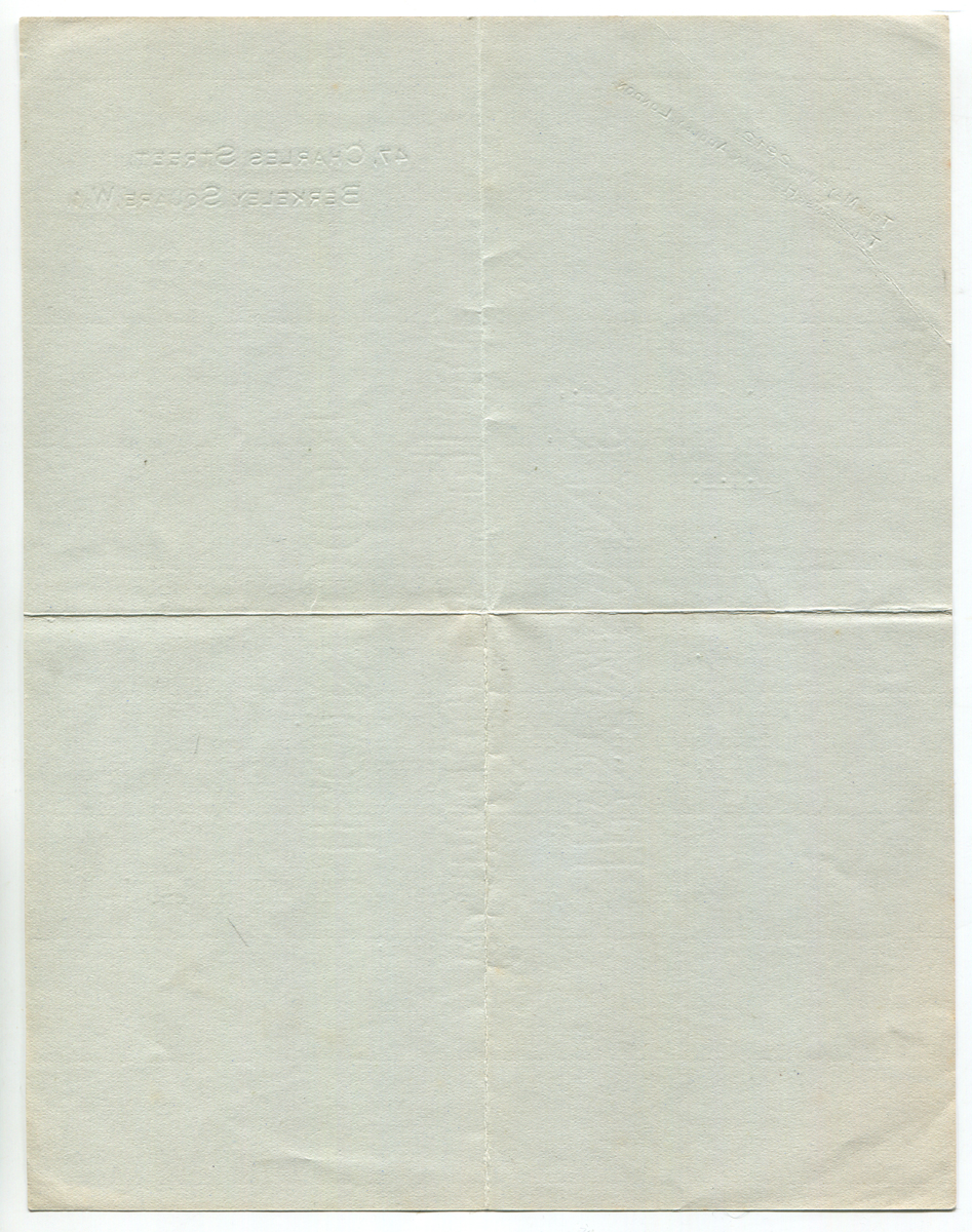 Typed on 8 ½” x 7” pale sage stationery bearing the address: “47, Charles Street, Berkeley Square, W. 1.” and dated May 4th, 1933. Item #A01994