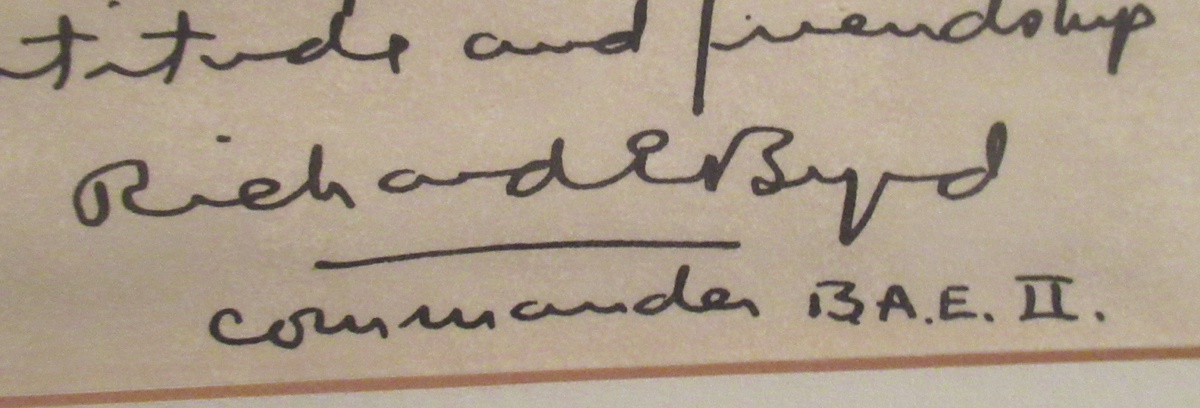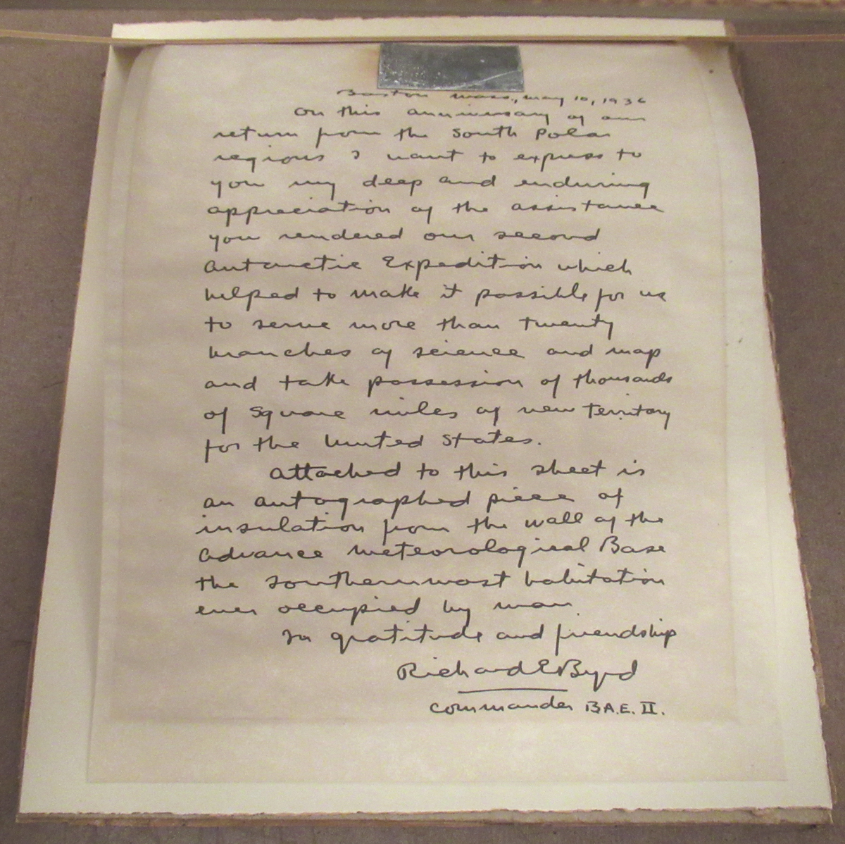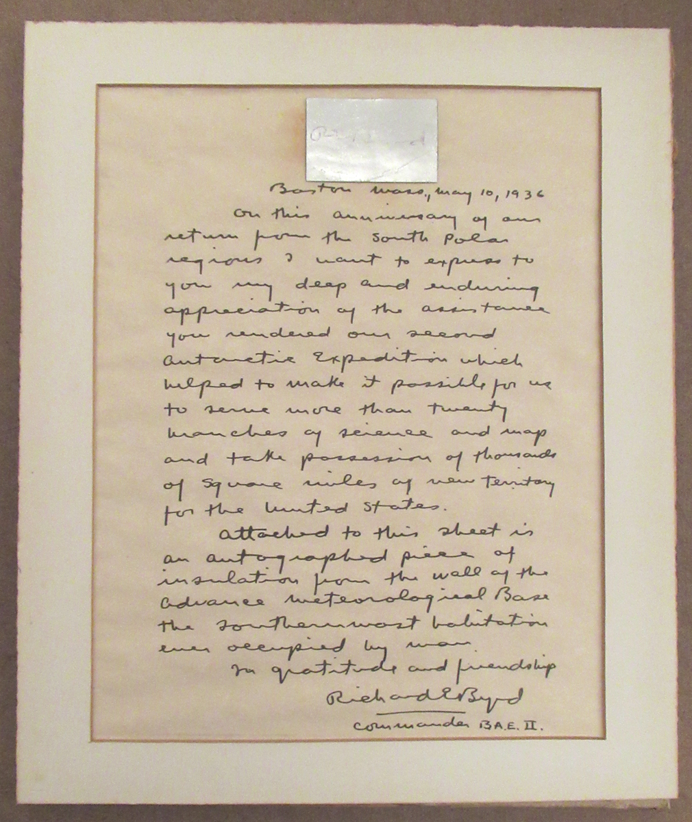 Description: This signed relic is affixed to a printed one-page letter (“Boston Mass., May 10, 1936”) in which Rear Admiral Byrd expresses his “deep and enduring appreciation of the assistance” that enabled his second expedition to Antarctica, 1933-34, after which they were able to help “twenty branches of science” and also “map and take possession of . . . new territory for the United States. Attached to this sheet is an autographed piece of insulation from the wall of the advance meteorological base the southernmost habitation ever occupied by man. In gratitude and friendship / Richard Byrd / Commander B. A. E. II”