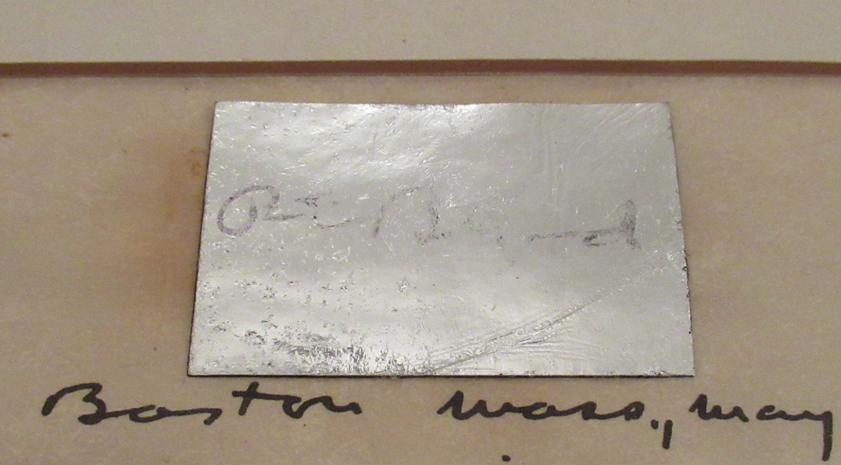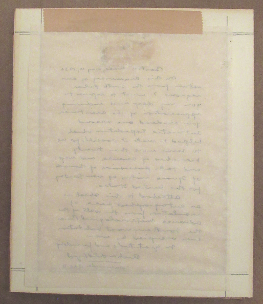 The metallic 1¼”x 2” piece of insulation is signed and glued to the 10 ½” x 8 ½” letter which is hinged at the top to an early mat. Item #A01997