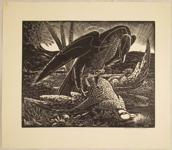 Description: In this powerful image an imposing bird with one piercing eye visible and a menacing, sharp curved beak towers over his vanquished prey. The wood engraving is initialled in the block, as well as, signed in full in graphite at the lower right margin.