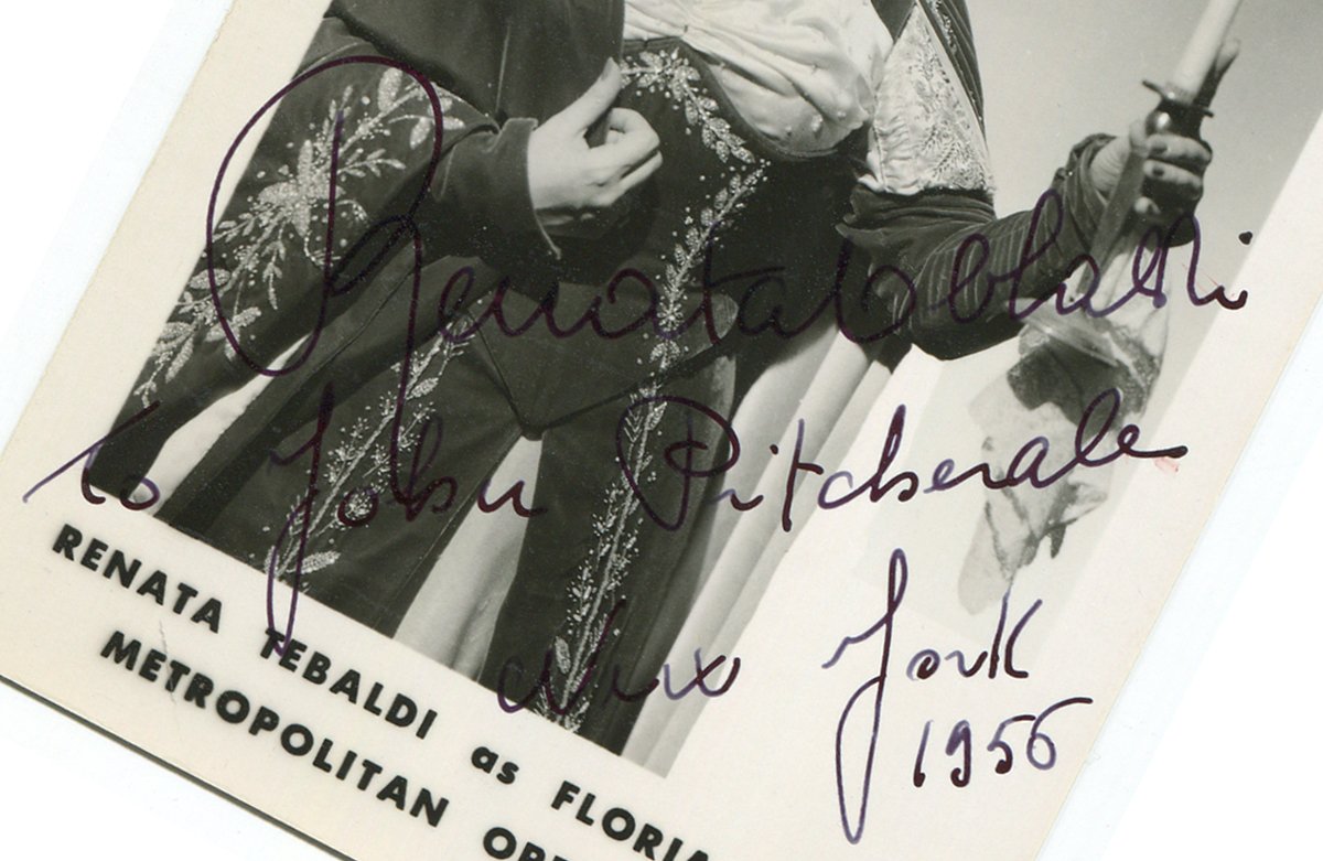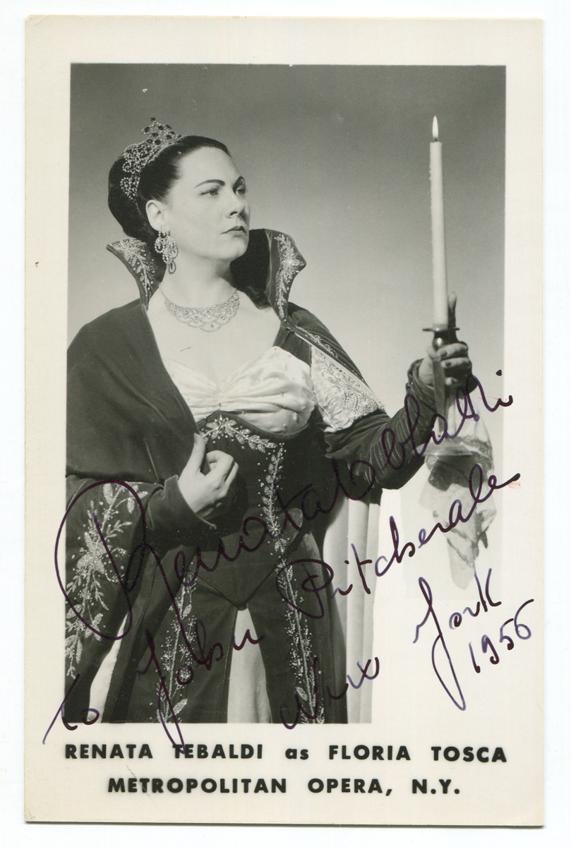 Description: Renowned Italian operatic soprano Renata Tebaldi (1922-2004) inscribed and signed this black and white real photo postcard with an image of Tebaldi dressed in her role as Floria Tosca for the Metropolitan Opera. The inscription reads: “Renata Tebaldi to John Pitcherale New York 1956″.