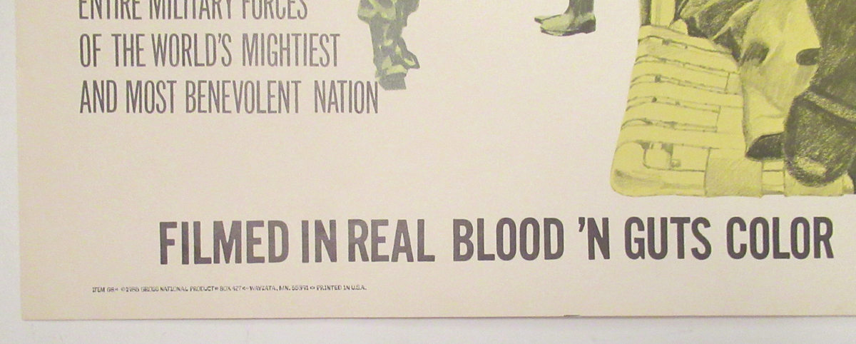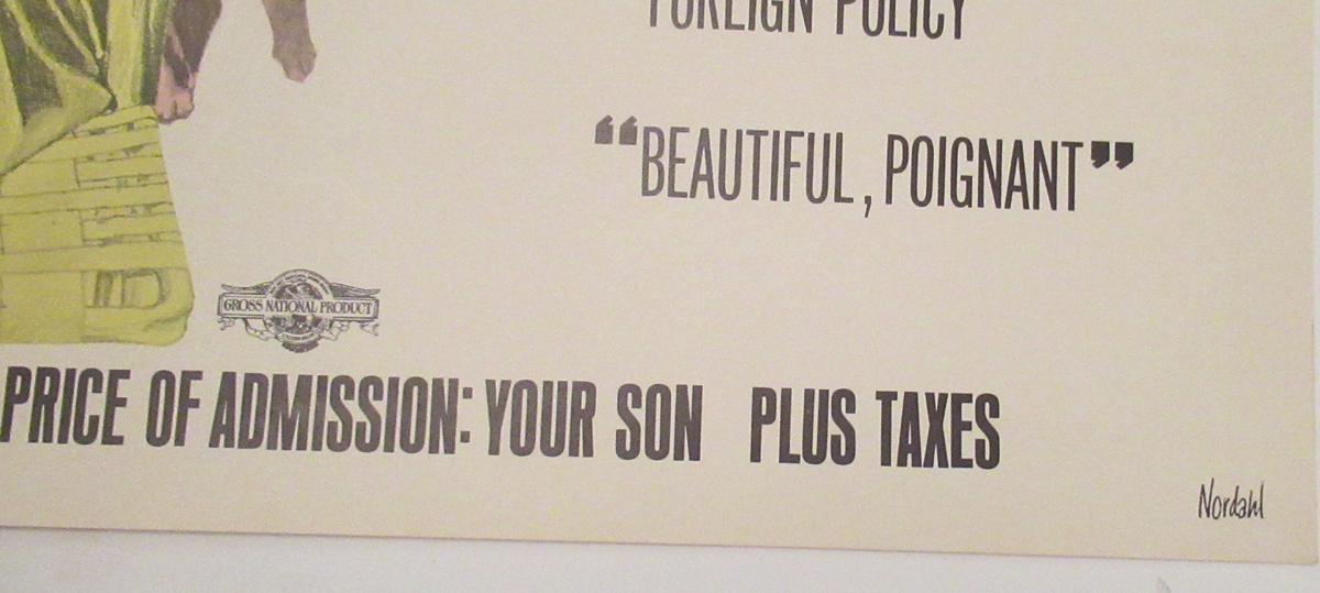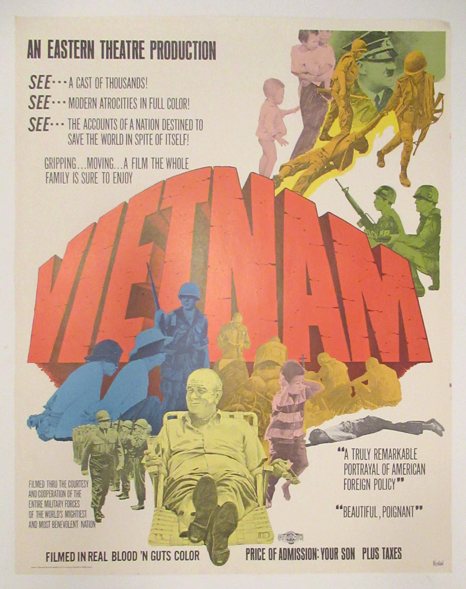 Description: This wonderfully satiric original poster advertises a mock movie: “Vietnam: An Eastern Theatre Production”. A relaxed LBJ lounges in a beach chair in the foreground with “filmed in real blood and guts color” images of Hitler, slain children, etc. in the background. “Price of Admission: Your Son Plus Taxes”.