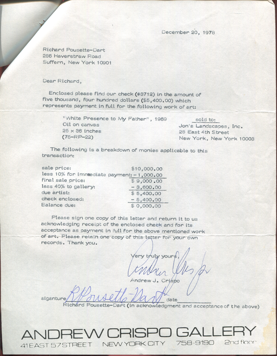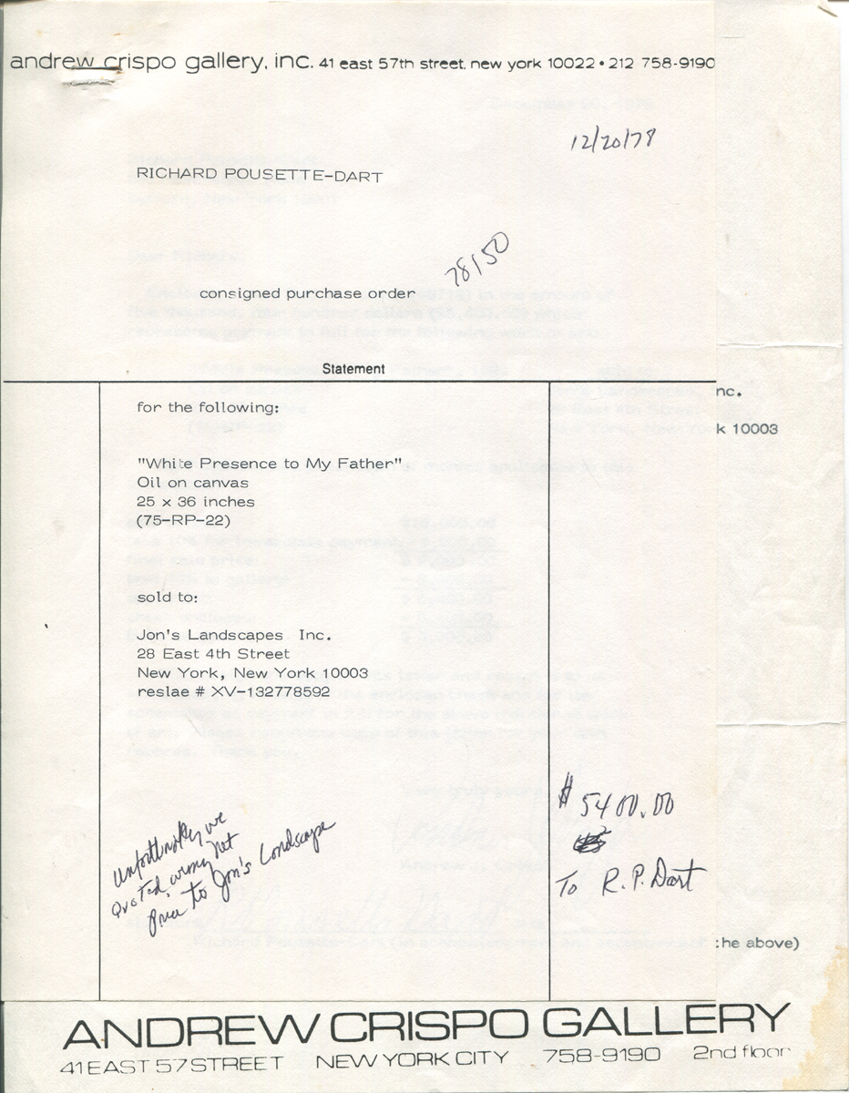 Description: Abstract Expressionist Pousette-Dart was a regular exhibitor at the Andrew Crispo Gallery (NYC) during the late 1970’s. He received payment for the sale of his painting “White Presence to My Father” on Dec. 20, 1978… for which he netted $5,400.00. Both Pousette-Dart and Andrew Crispo signed the receipt. Interestingly, Christie’s resold this painting at auction on Nov. 10, 2023 for $151,200.00.