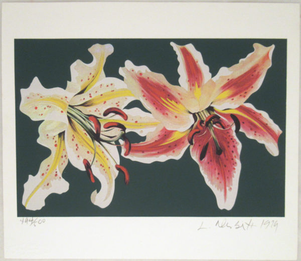 Description: This serigraph is classic Nesbitt with two lilies forcing themselves on the viewer as they fill the image area.