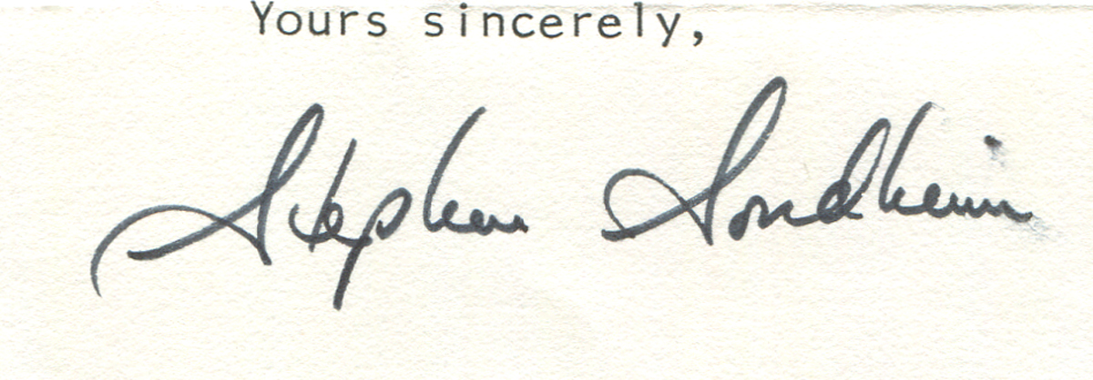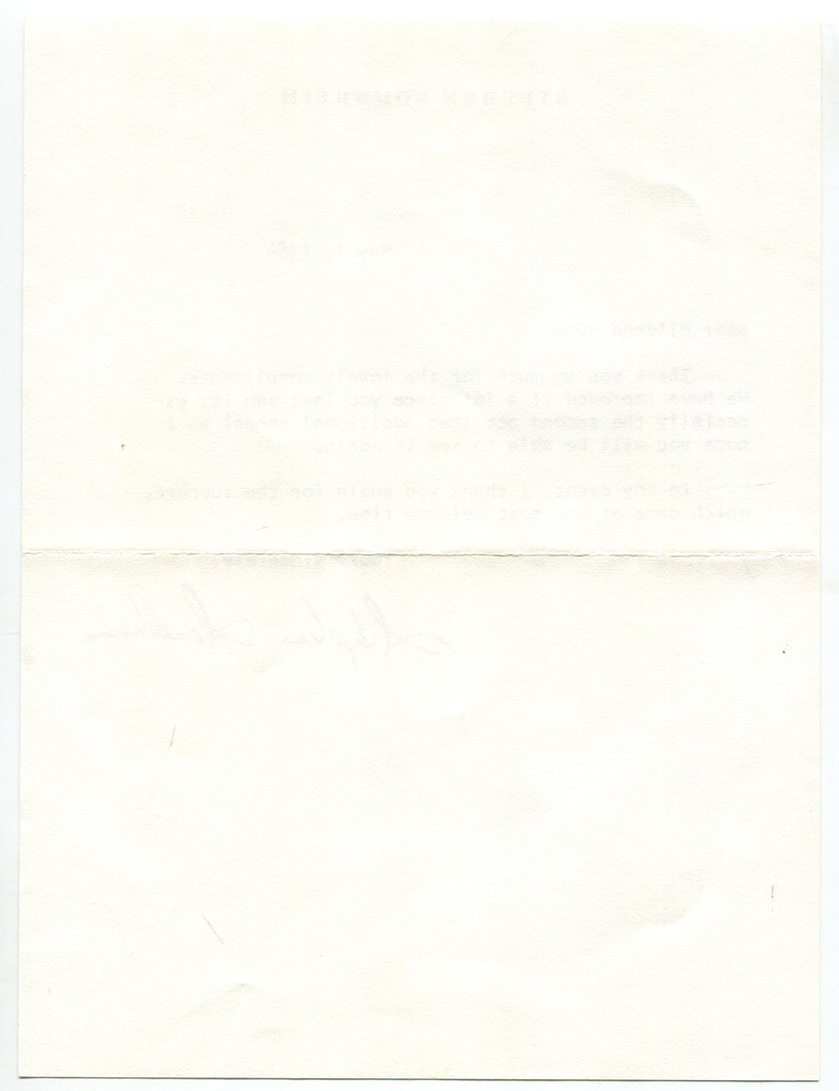 Letter is written on an 8″ x 6″ sheet of personal stationery imprinted “Stephen Sondheim” and dated May 1, 1984. Item #A02002