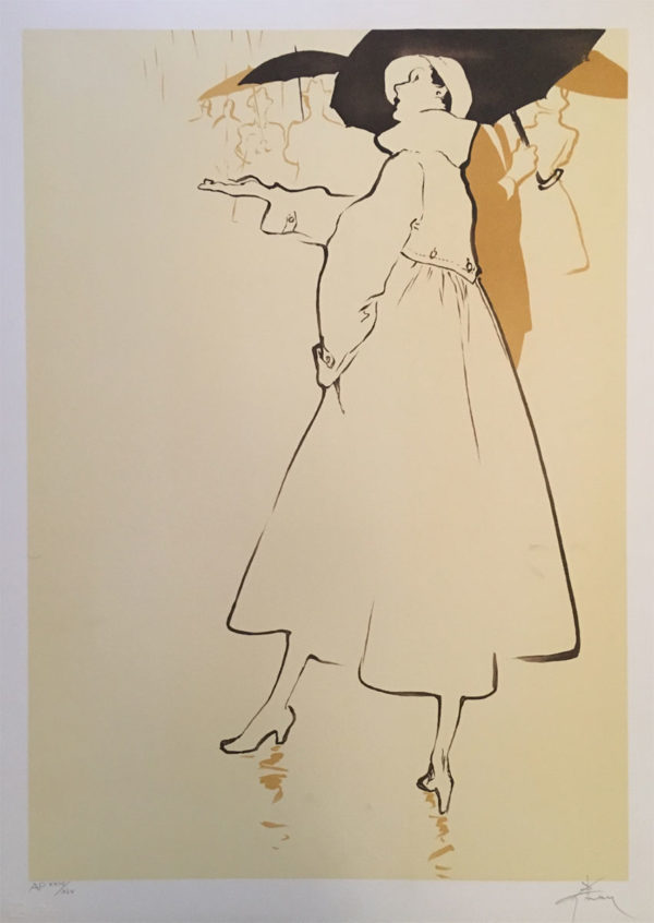 Description: We offer a signed print by Rene Gruau, titled “Rain, Rain.” The image is 26 7/8” x 21” printed on heavy arches paper, 29 ½” x 21 ¼”. Signed and editioned in graphite along the bottom margin, artists proof XXIII/XLV, with the Circle Gallery blindstamp at the lower left corner. Item# PR00227.