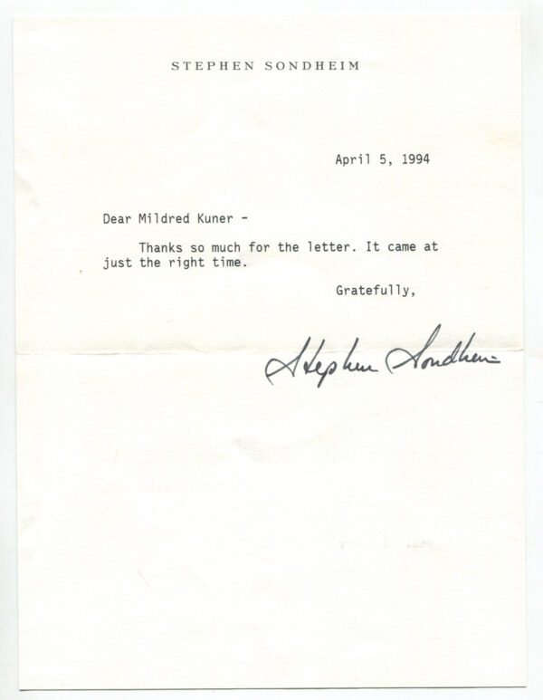 Description: In this brief typed letter signed Sondheim thanks an admirer for her letter.