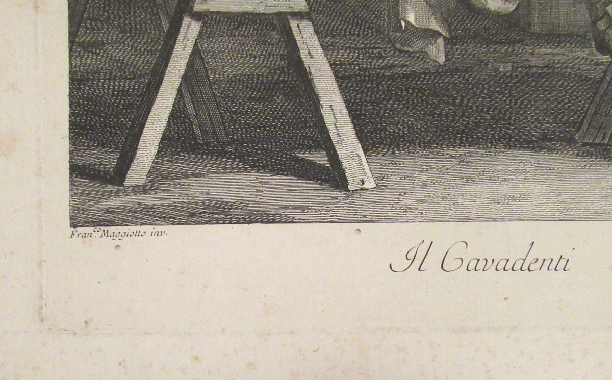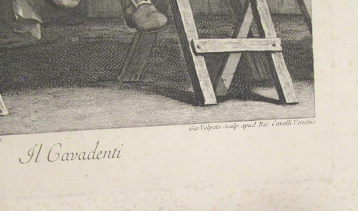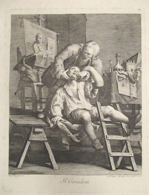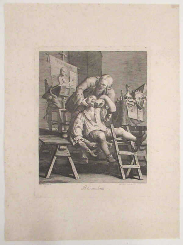Description: This wonderful original 18th century copperplate engraving shows a rather impromptu bit of dentistry. A frock-coated “dentist” works on a tooth extraction from a patient sitting on a plank supported by sawhorses. A monkey trying on a hat watches from a chair in the background. The print is by Giovanni Volpato after Francesco Maggiotto. It was published by Nicolo Cavalli, c. 1760-1770.