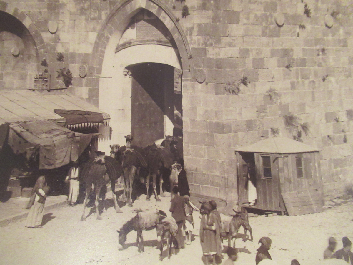 The image shows the historic Ottoman gate built in 1538 which is one of the seven main open gates of the Old City of Jerusalem. A sign for “Cook’s Tourist Office” directs visitors inside Jaffa Gate with a painted hand pointing toward the arched entrance. Numerous people, donkeys, and camels stand in front of the great stone edifice or are in the act of moving through the gate into the city.