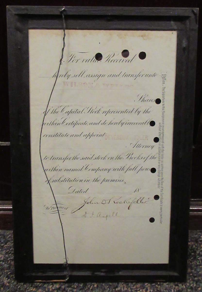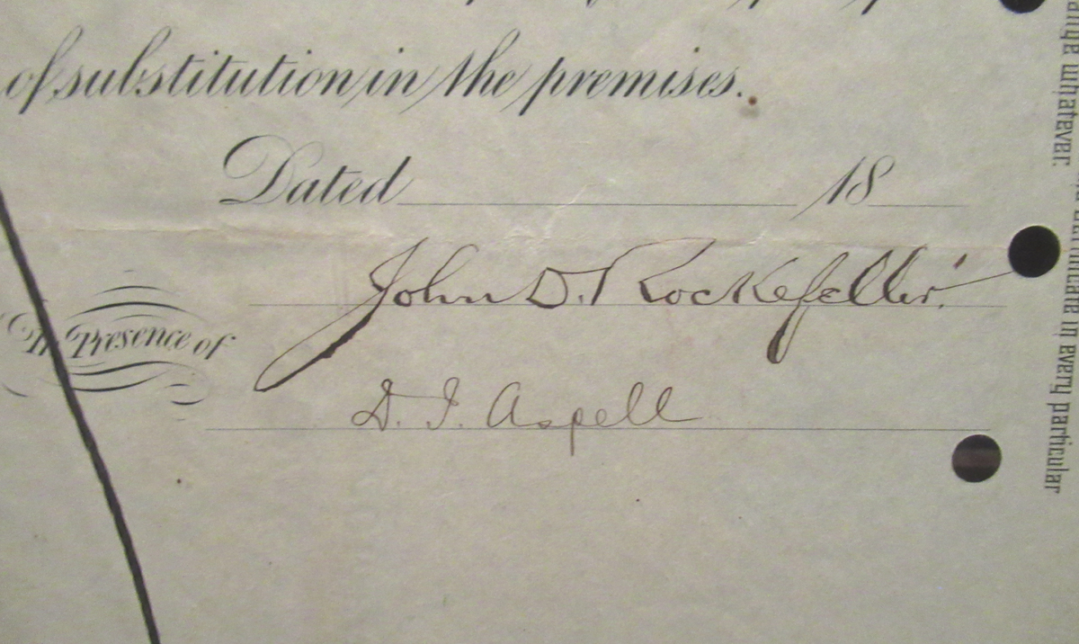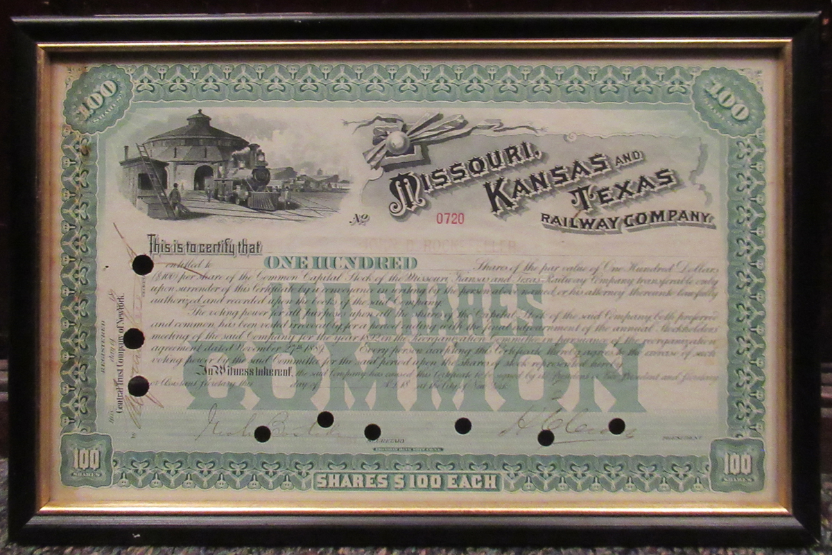 Description: This one hundred share stock certificate for the Missouri, Kansas and Texas Railway Company is issued to John D. Rockefeller and signed on the verso. Signature is witnessed (“In Presence of”) by D. I. Aspell, a clerk who worked for the Standard Oil Co. from 1889 to 1891.