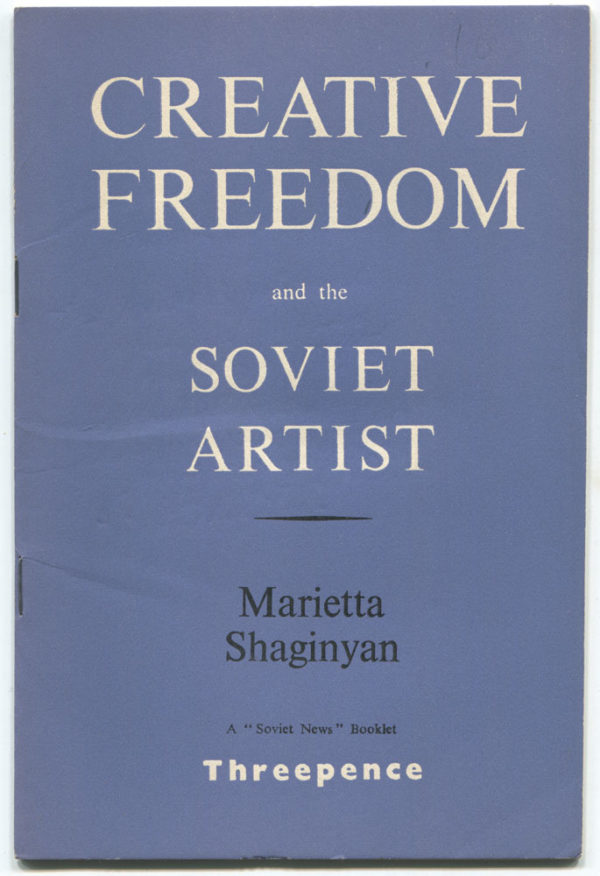 Size: 12mo. Text body is clean, and free from previous owner annotation, underlining and highlighting. Binding is tight, covers and spine fully intact. Side stapled blue printed wraps, a “Soviet News” Booklet, 16 pages, advertisements for other Soviet News booklets printed inside back cover. Pages lightly toned, lower corners very lightly creased. “Marietta Shaginyan was a known writer before the Revolution. In Soviet times she has had many books published and is a frequent contributor to the Soviet Press. She was awarded a Stalin Prize for her book Journeys in Soviet Armenia.” Quantity Available: 1. Shipped Weight: 1 lb 0 oz. Category: Art & Design; Pictures of this item not already displayed here available upon request. Inventory No: 010890.