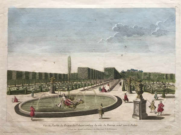 Description: We offer a hand colored optical engraving of the royal gardens at Schuarzenberg. The plate is 10 ¾” x 15” on ivory laid paper that is 13 ¾” x 17 3/8”. The title under the image reads “Vue due Jardin du Prince de Schuarzenberg du cote du Bassin rond vers le Palais. A Paris chez Mesard rue Grenetat a la Renommee de la Cornemuse.”