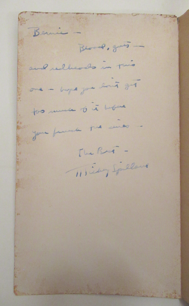Description: In 1947, Mickey Spillane wrote his first extremely successful, potboiler mystery, I, Jury, to enable the purchase of a house in Newbury, N.Y. with his first wife, Mary Ann Pearce. Other Mike Hammer–his archetypal hard-man detective–novels soon followed. Bernard C. Levy (1921-81) aka “Bernie” was a mail carrier on the Rural Free Delivery, No. 3 route out of Newburg, N. Y., who befriended celebrities and farmers alike. These thankful rural residents left gifts, read out their poems, or as in the case of Spillane, gave him autographed paperback copies of his novels. The verso of the front wraps of the eight books in this collection are inscribed to “Bernie”, each expressing a different sentiment followed by the characteristic “Mickey Spillane” signature. The books are: I, Jury (2), My Gun is Quick, Vengeance is Mine, The Big Kill, The Lonely Night, The Long Wait, and Kiss Me, Deadly.