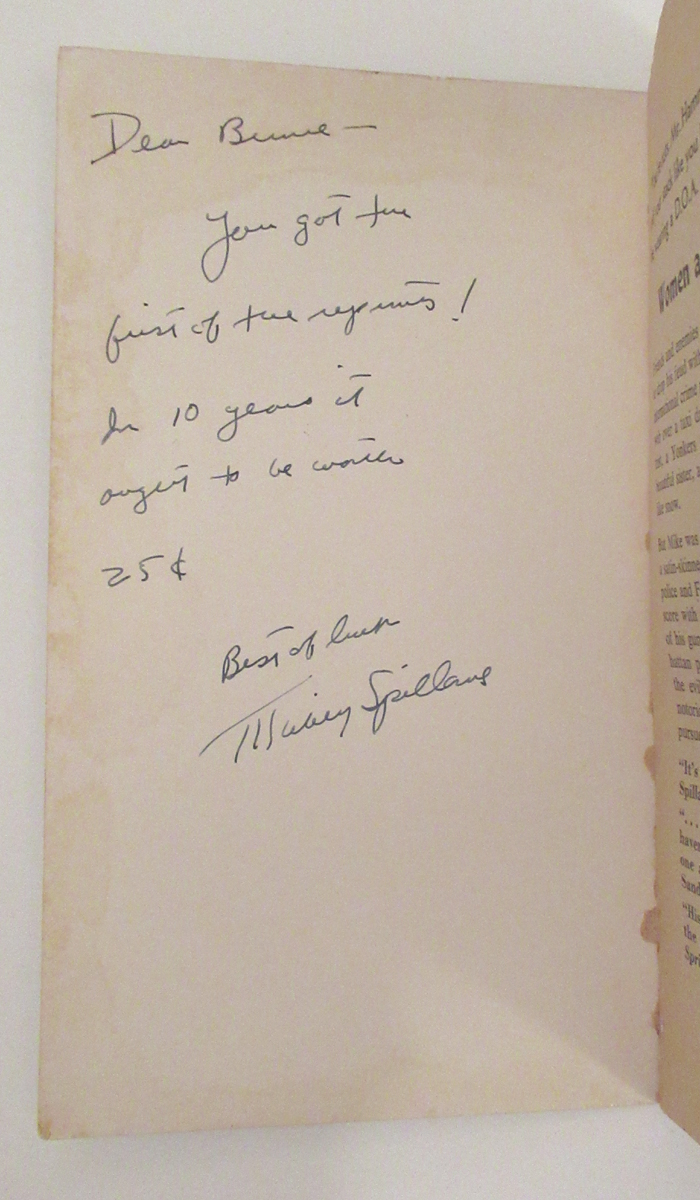 “Well, here’s the first of Mike–and his collection of blondes. Too bad they’re not real, huh?”; “Here’s to bigger and heavier mails.” The actor Biff Elliot (1923-2012) who starred as Mike Hammer in I, Jury (1953) adds another sentiment below Spillane’s: “If you doubt that she was all blonde Ask me. Biff Elliot”; “Blood, guts–and redheads in this one–hope you don’t get too much of it before you finish the series–”; “Don’t let the ending of this one get you–people like that happen–”; “Here’s the latest–but not the last of Mike–you got this one a month before it hit the stands–so don’t let too many in on it too soon–”; “This is the job the gals usually go for–plenty of active research went into it–”; “Well–you’re one of the first to read this job (The Long Wait), but I hope you enjoy it–”; “You got one of the first reprints! In ten years it ought to be worth 25c.”
