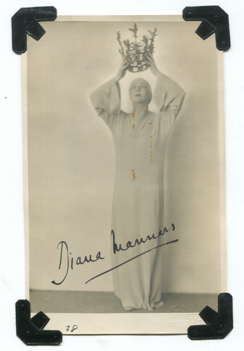 Description: The actress Diana Manners signed across the bottom of a real photo postcard of her image as a nun in a long robe holding a crown over her head in The Miracle.