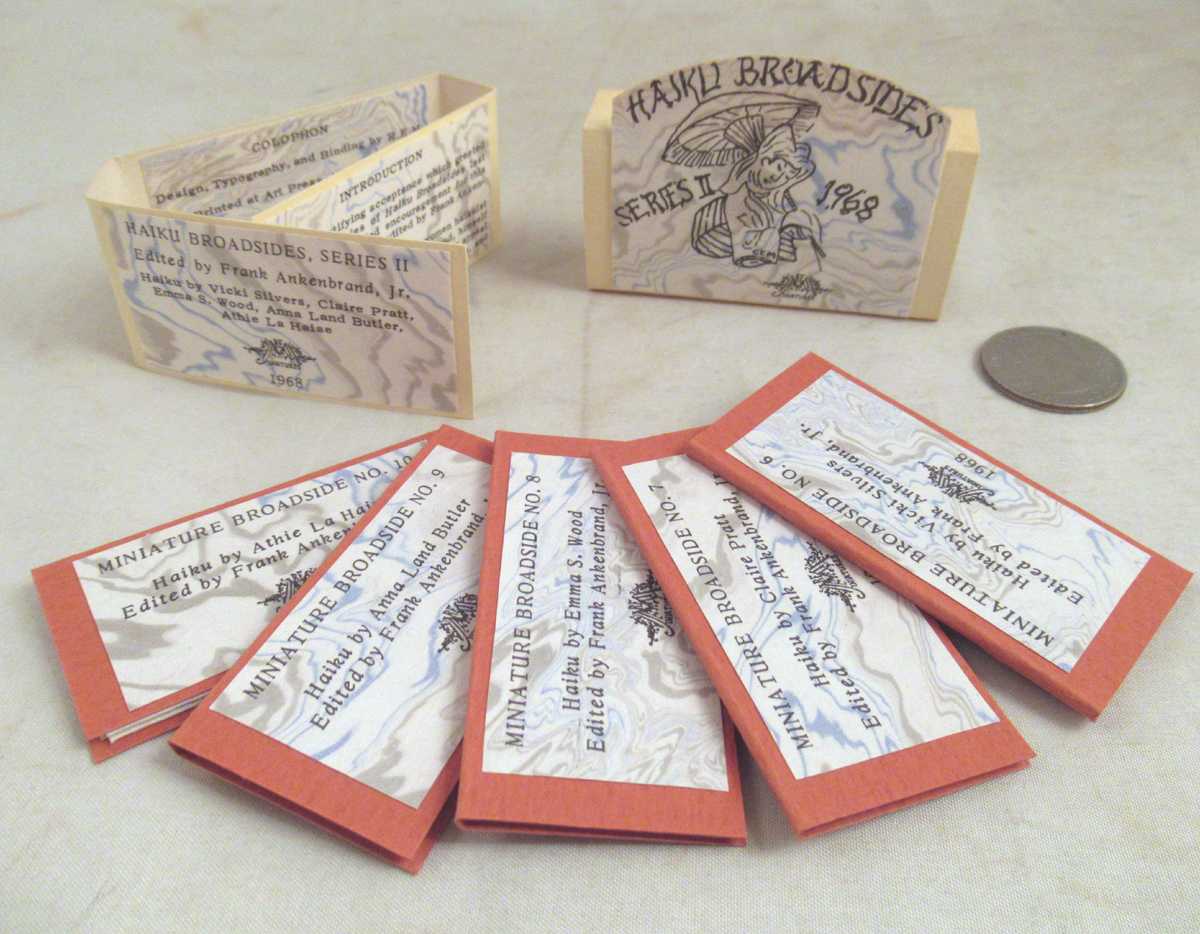 Size: Miniature (2″ x 2 5/8″). . Miniature production of five individually bound sheets of Haiku housed in a tri-fold portfolio and slipcase. Haiku by Vicki Silvers, Claire Pratt, Emma S. Wood, Anna Land Butler, and Athie La Haise This set is number 164 of a limited edition of 200 numbered copies Quantity Available: 1. Shipped Weight: 1 lb 0 oz. Category: Poetry; Pictures of this item not already displayed here available upon request. Inventory No: 016619.