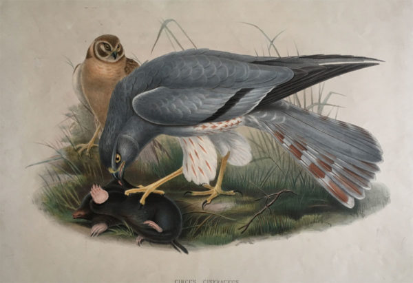 Description: We offer a large hand-colored lithograph by J. Gould and H.C. Richter. The composition is roughly 12” x 17” on ivory paper that measures 15” x 22”. The inscription along the lower margin reads: “J. Gould and H.C. Richter del. Et lith. Circus Cineraceus, Walter Imp.” It is engraved by John Gould and Henry Constantine Richter for the notable work The Birds of Great Britain, published between 1862 and 1873. The print retains its full margins, including the staggered sewing holes along the binding edge. Item #PR00269.