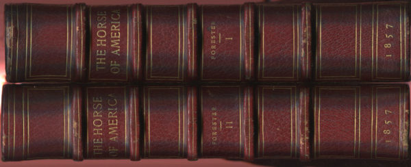 Size: 4to. 2-volume set (complete). Text body is clean, and free from previous owner annotation, underlining and highlighting. Rebound in red gilt ruled leather with five raised bands on spine, top edges gilt, inside of covers are leather bound as well, silk free end papers, the original front and back covers are bound in as well as the back strip (front cover has a very bright and nice gilt illustration with two horses, original back strip is illustrated as well in gilt with the title “The Horse of America” Frank Forester); Volume I, steel engraved vignette title page “The Horse of America” by Frank Forester, designed by F. O.C. Darley and engraved by R. Hinshelwood, errata sheet to both volumes tipped in, 552 pages, illustrated with 8 steel engraved portraits of celebrated horses and 13 wood engravings executed by N. Orr, List of Authorities Consulted in Used in the Preparation of This Work; Volume II, steel engraved vignette title (different from the one in Volume I) designed by F. O.C. Darley and engraved by J. Smillie, 6 steel engraved portraits of celebrated horses, 43 wood engravings executed by N. Orr, 576 pages, Index. Both volumes have two previous owner bookplates, those of William Baylis jun. and Abraham Burtis Baylis. Volume I, covers stained, leather worn on both sides of spine, corners, spine ends and along edges, vignette title page is moderately foxed, title page lightly foxed, damp stain along bottom edges of pages in blank margin, some of the steel engravings have foxing in blank margins while others have none, offsetting from engraving on to facing page, text pages generally not foxed, rear cover has short separation at head of spine; Volume II, covers scuffed/scratched/stained, leather worn along sides of spine, along edges, spine ends and corners, vignette title is foxed, foxing situation in text similar to that in Volume I, both covers have slight separation at gutter at head of spine. This is a heavy set and will require extra postage. Quantity Available: 1. Shipped Weight: 12 lbs 4 oz. Category: Animals & Birds; Inventory No: 010900.