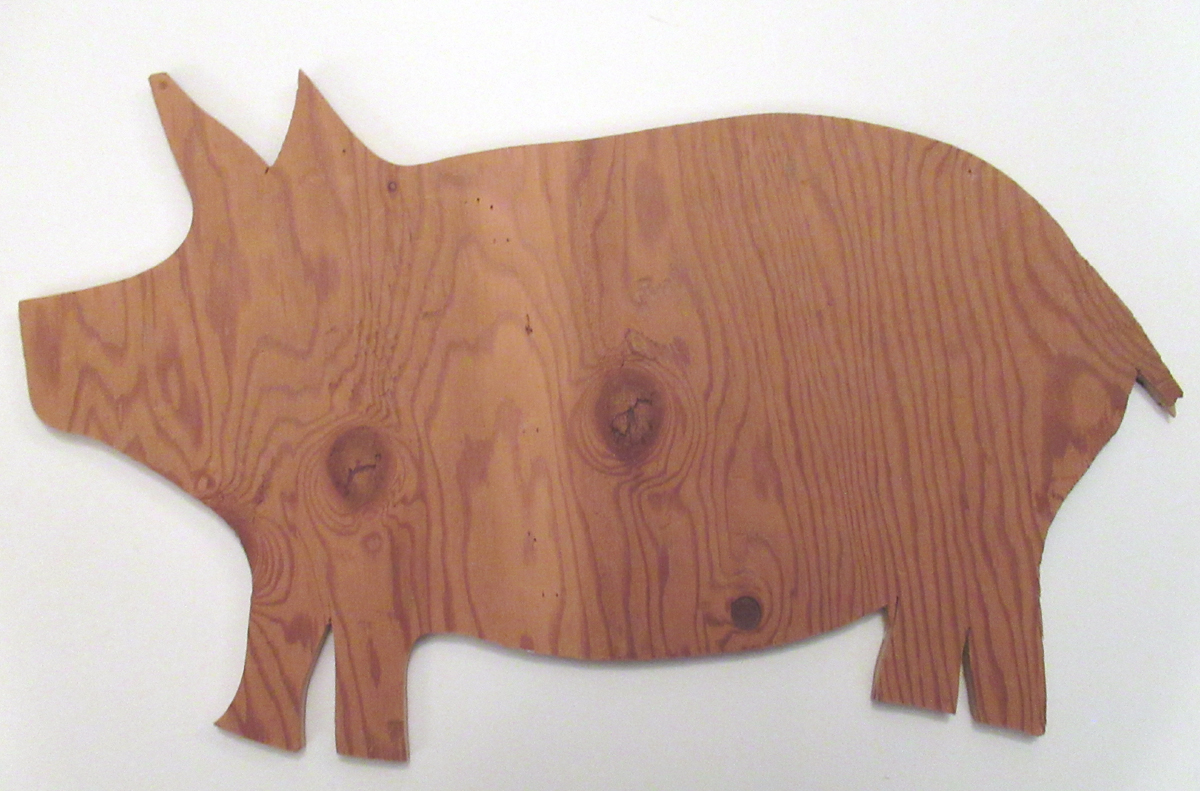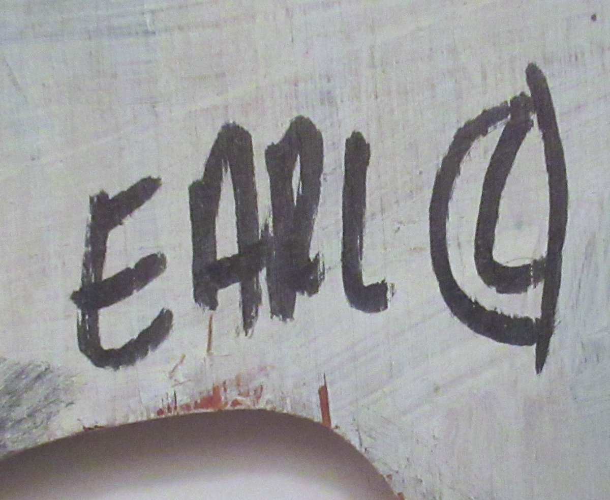 Description: In Earl’s whimsical style, this lovable black and white pig is painted on a cut-out piece of 1/2″ plywood. His signature “Earl” and a copyright symbol are at the lower right.