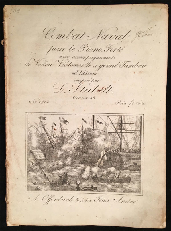 Description: Illustrated sheet music for Combat Naval, Oeuvre 36 by D. Steibelt. Printed on 13"x 9 1/2" laid paper in the late 18th c./early 19th c. by the publisher Jean Andre. The cover reads: “Combat Naval pour le Piano Forte avec accompagnement de Violon, Violoncelle et grand Tambour, compose par D. Steibelt, Oeuvre 36, A Offenbach s/m, chez Jean Andre.” Illustrated with a dramatic battle scene rendered with facile, energetic crosshatching. Item #PR00142. Daniel Gottlieb Steibelt (1765–1823) was a German born pianist and composer who died in Saint Petersburg, Russia. His main works were composed in Paris and in London. Condition: The paper is lightly toned with some scattered foxing. There is a small indentation which pushes through all the pages (without any paper or text loss). The piece has been disbound from a larger collection, but is complete in 11 pages, overall good condition.