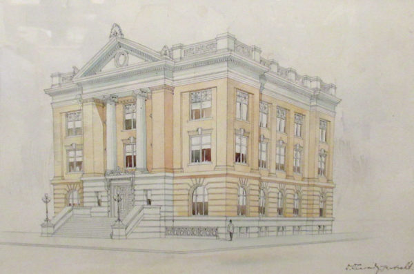 Description: We offer an original architectural drawing of a neoclassical building signed by architect David Demarest Cassidy Jr. The pen & ink and watercolor rendering depicts a quintessential bank or library building built in the late 19th century with authoritative symmetry. The image is 10” x 15” and housed in an oak frame with outside dimensions 16” x 21 ½”. It is signed at the lower right “D. D. Cassidy, Jr. Archt.” Item #FA00210.