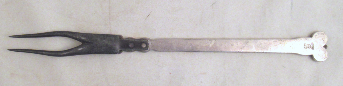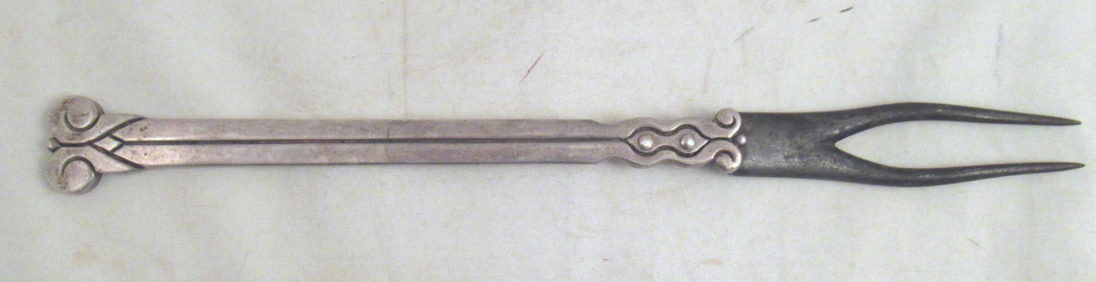 Description: This extremely sculptural roast carving fork has two steel tines, reminiscent of steer horns, and a 940 silver handle in the Aztec pattern.