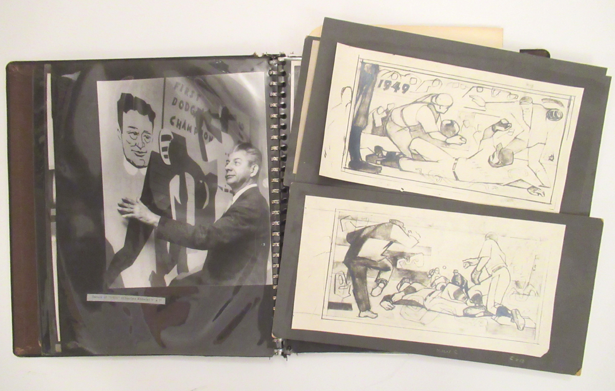 A brown leather-bound ring binder (14 ½” x 12 ¼”) labelled “Van Veen Murals” has eighteen sleeves with approximately sixty items. Item #DA00467