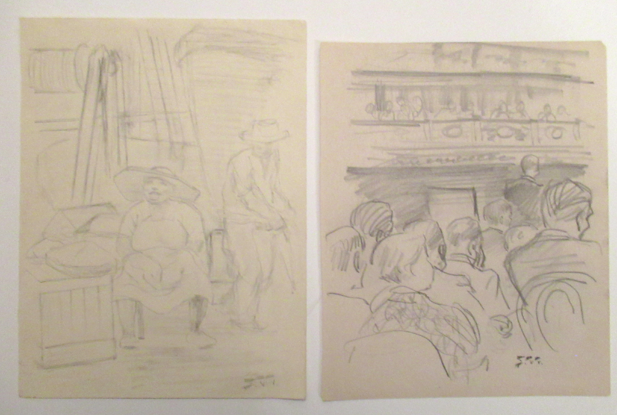 The second sketch is a detail of a theatre. (“At Carnegie hall” is inscribed in ink on verso). The foreground has a tight profile of the backs of a seated audience looking towards a stage. The people in the box seats at the top of the page, however, are depicted with squiggly lines. Initialed “S. V. V.” in ink at the lower right and drawn on an 8 ¾”x 6 ¾” sheet of ivory paper.